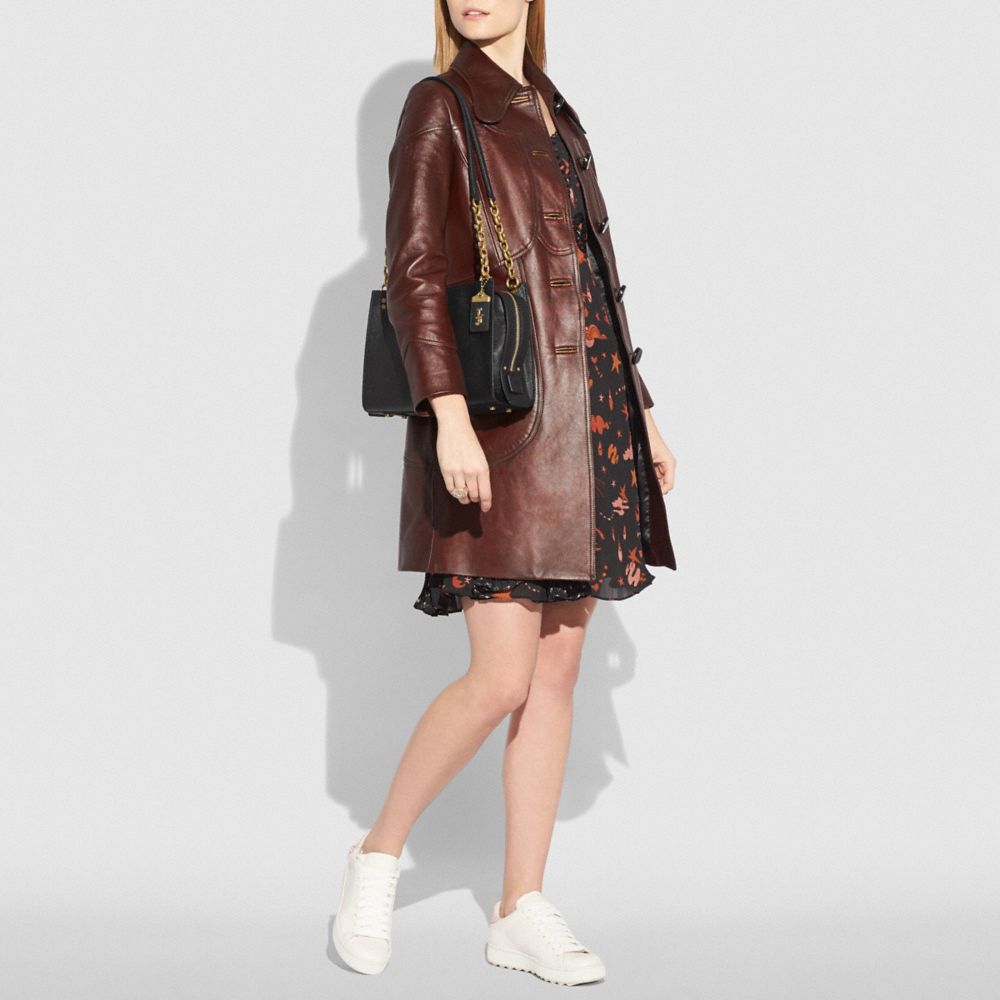 Grain leather| Inside zip and snap pockets| Zip closure, fabric and leather lining| Two open compartments| Straps with 12" drop for shoulder wear| 11" (L) x 7 3/4" (H) x 4 1/4" (W)
