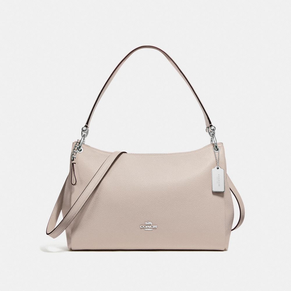 | Refined pebble leather| Inside multifunction pocket| Zip-top closure, fabric lining| Handle with 8 3/4" drop| Detachable strap with 20" drop for shoulder or crossbody wear| 12 3/4" (L) x 9 1/2" (H) x 5 1/4" (W)