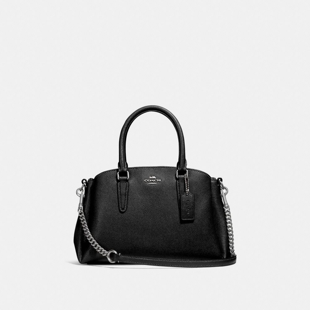 | Crossgrain leather| Center zip compartment| Snap closure, fabric lining| Handles with 4" drop| Detachable strap with 20" drop for shoulder or crossbody wear| 9 3/4" (L) x 6 3/4" (H) x 4 1/4" (W)