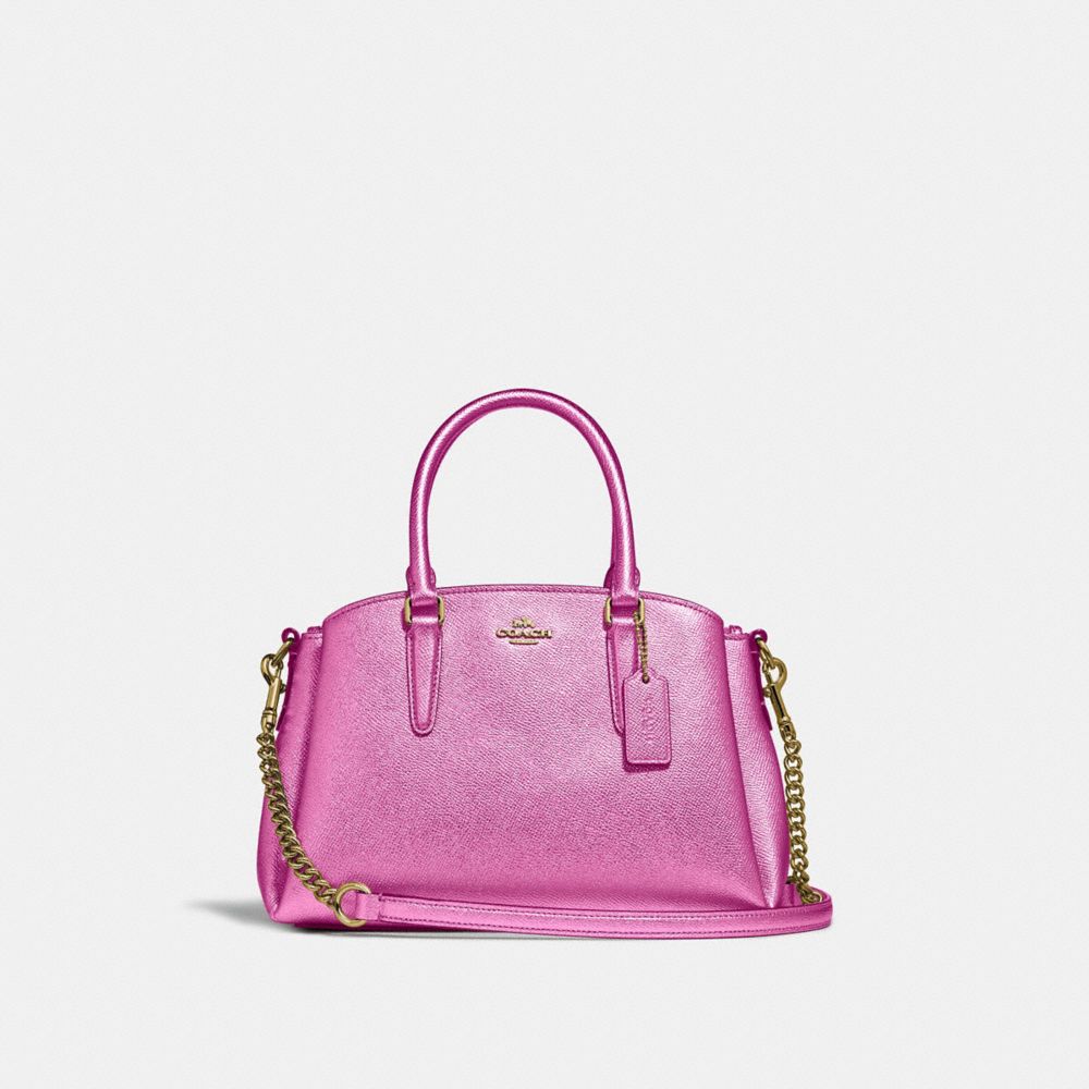 Metallic crossgrain leather| Center zip compartment| Snap closure, fabric lining| Handles with 4" drop| Detachable strap with 20" drop for shoulder or crossbody wear| 9 3/4" (L) x 6 3/4" (H) x 4 1/4" (W)