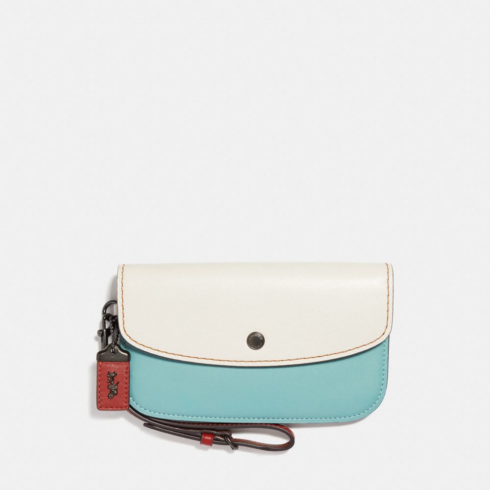 Glovetanned leather| Two credit card slots| Inside zip and open pockets| Snap closure| Outside slip pocket| Detachable wrist strap| 7 1/4" (L) x 4 1/4" (H) | Fits all phone sizes up to an iPhone X