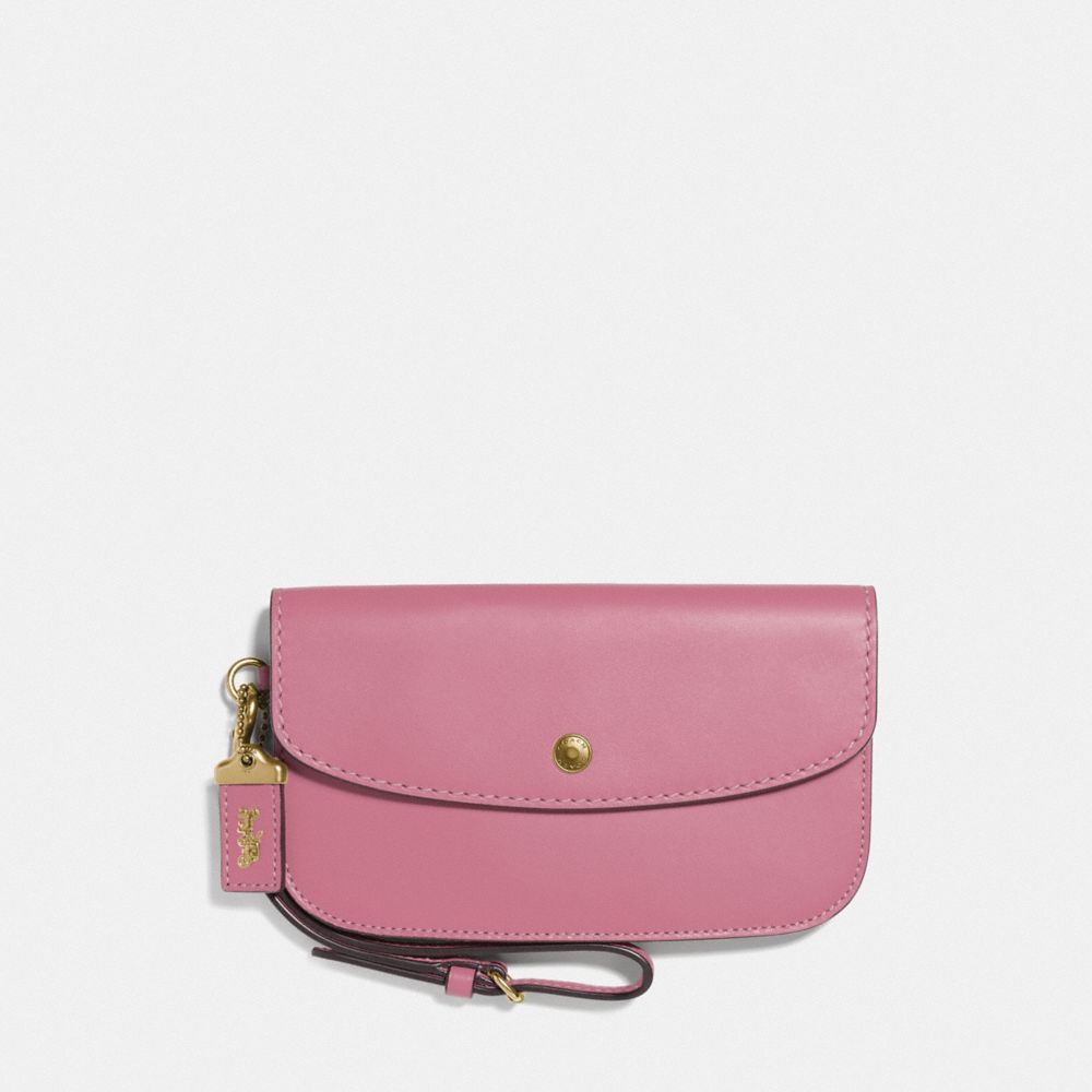 Glovetanned leather| Two credit card slots| Inside zip and open pockets| Snap closure| Outside slip pocket| Detachable wrist strap| 7 1/4" (L) x 4 1/4" (H) | Fits all phone sizes up to an iPhone X