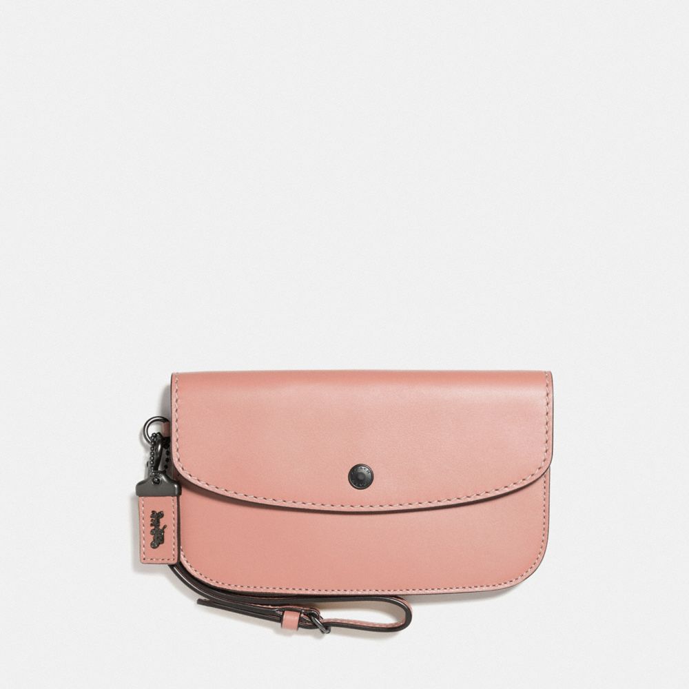 Glovetanned leather| Two credit card slots| Inside zip and open pockets| Snap closure| Outside slip pocket| Detachable wrist strap| 7 1/4" (L) x 4 1/4" (H) | Fits all phone sizes up to an iPhone X