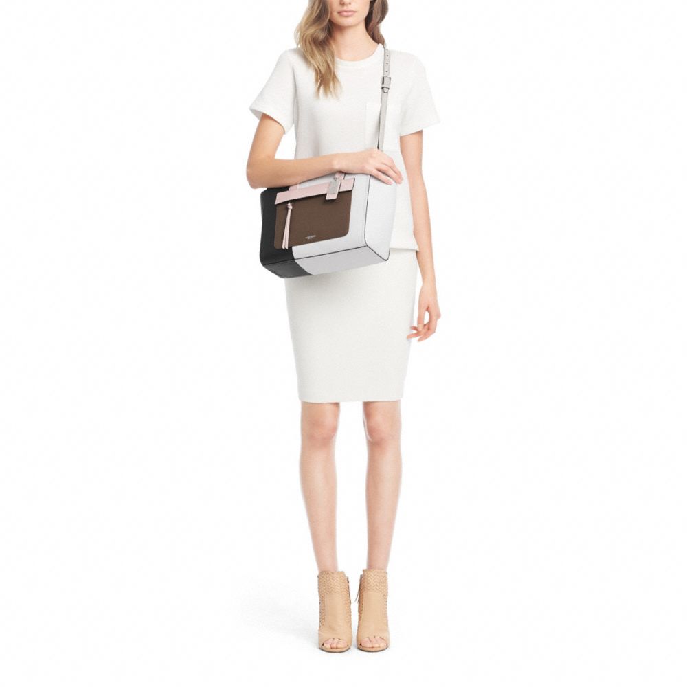 Details| | | Colorblock leather| Inside zip, cell phone and multifunction pockets| Zip-top closure, fabric lining| Outside zip pocket| Handles with 5 1/2" drop| Strap with 15 1/2" drop for shoulder wear| 12 1/2" (L) x 9 1/2" (H) x 5" (W)