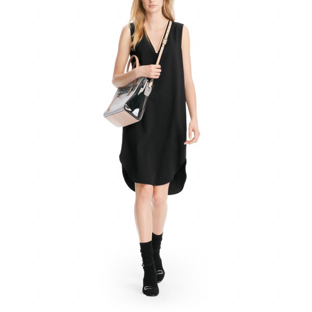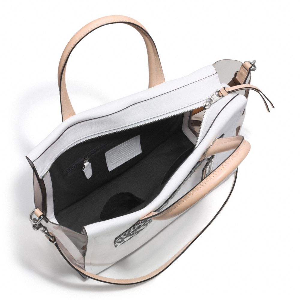 Details| | | Leather and vinyl| Inside zip, cell phone and multifunction pockets| Zip-top closure, fabric lining| Outside zip pocket| Handles with 5 1/2" drop| Strap with 15 1/2" drop for shoulder wear| 12 1/2" (L) x 9 1/2" (H) x 5" (W)