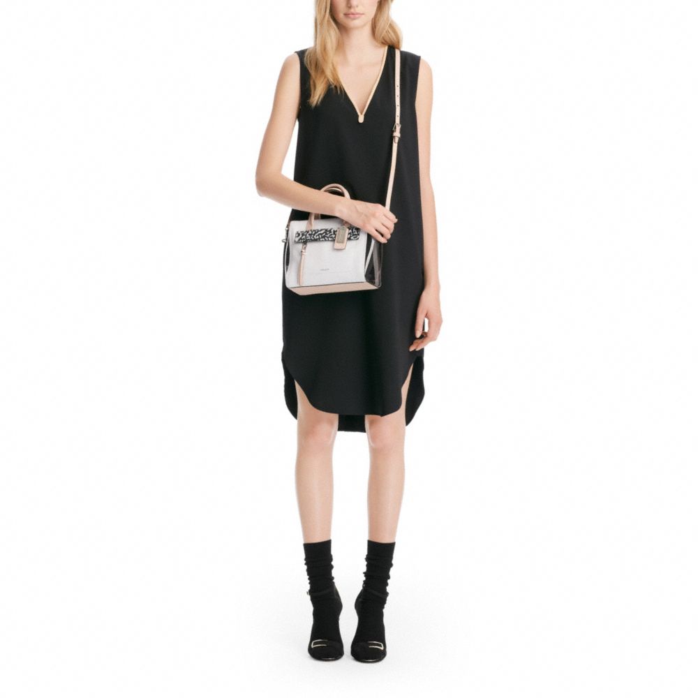 Details| | | Leather and vinyl| Inside zip, cell phone and multifunction pockets| Outside zip pocket| Zip-top closure, fabric lining| Handles with 3 1/4" drop| Strap with 21" drop for shoulder or crossbody wear| 8 3/4" (L) x 6" (H) x 4 1/4" (W)