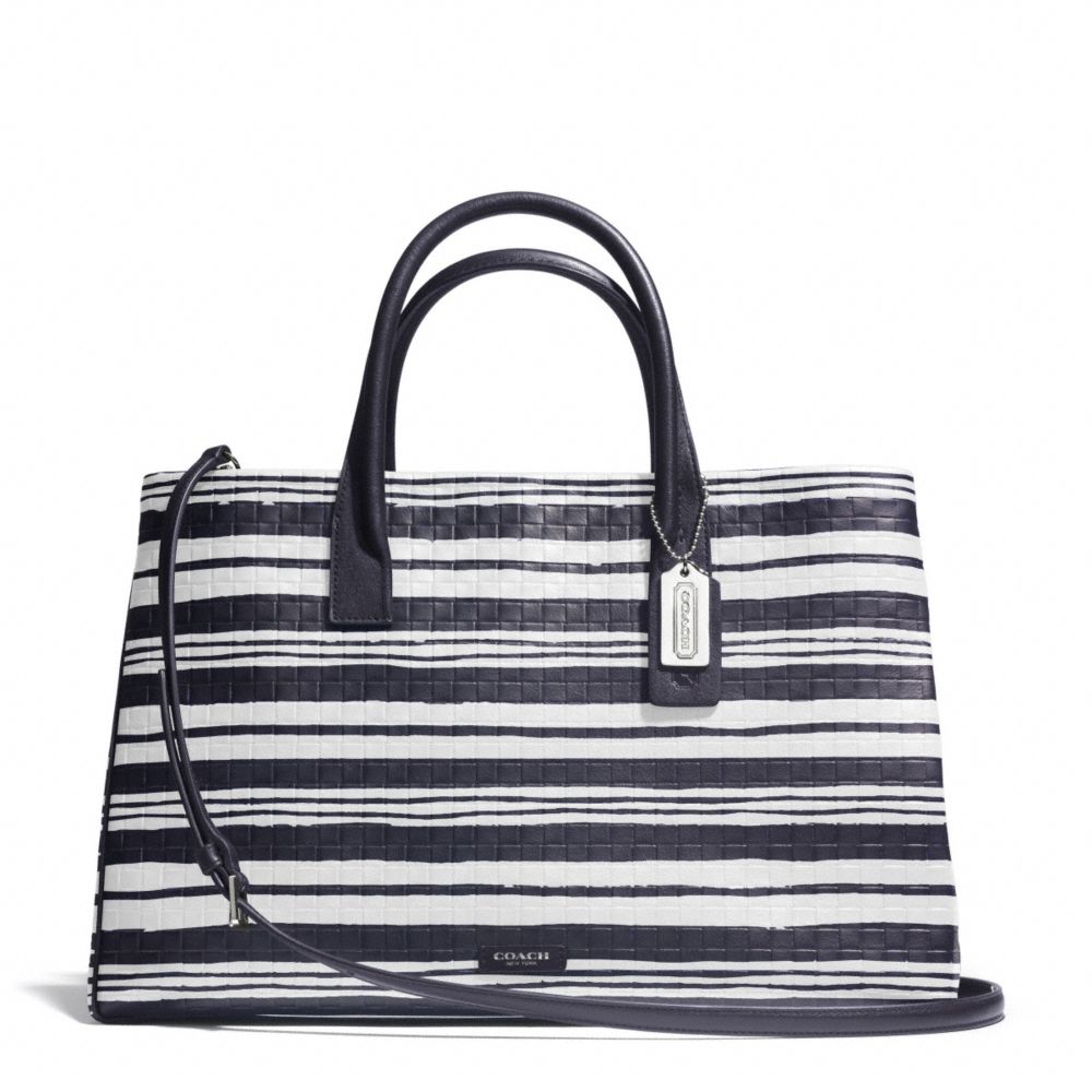 Details| | | Embossed woven leather| Inside zip, cell phone and multifunction pockets| Snap closure, fabric lining| Handles with 5" drop| Strap with 17" drop for shoulder or crossbody wear | 14 3/4" (L) x 9 3/4" (H) x 4 1/2" (W)