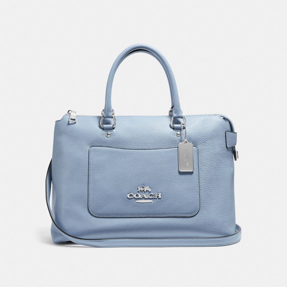 Refined pebble leather| Inside snap pocket| Zip-top closure, fabric lining| Handles with 4 1/2" drop| Outside slip pocket| Detachable strap with 22" drop for shoulder or crossbody wear| 12 1/2" (L) x 9 1/4" (H) x 5 1/2" (W)