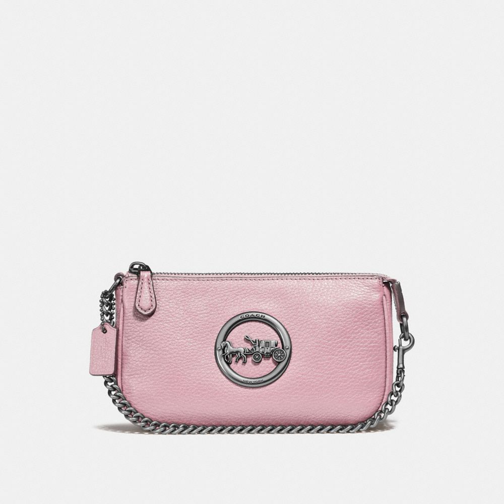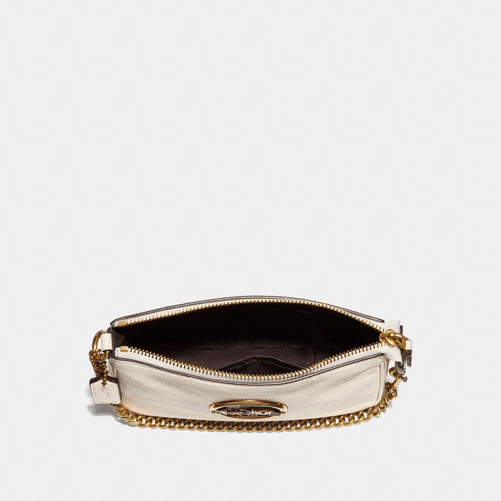 Refined pebble leather| Two credit card slots| Inside multifunction pocket| Zip-top closure, fabric lining| Strap with clip to form a wrist strap or attach to the inside of a bag| 7 1/2" (L) x 4 1/2" (H) x 2" (W)
