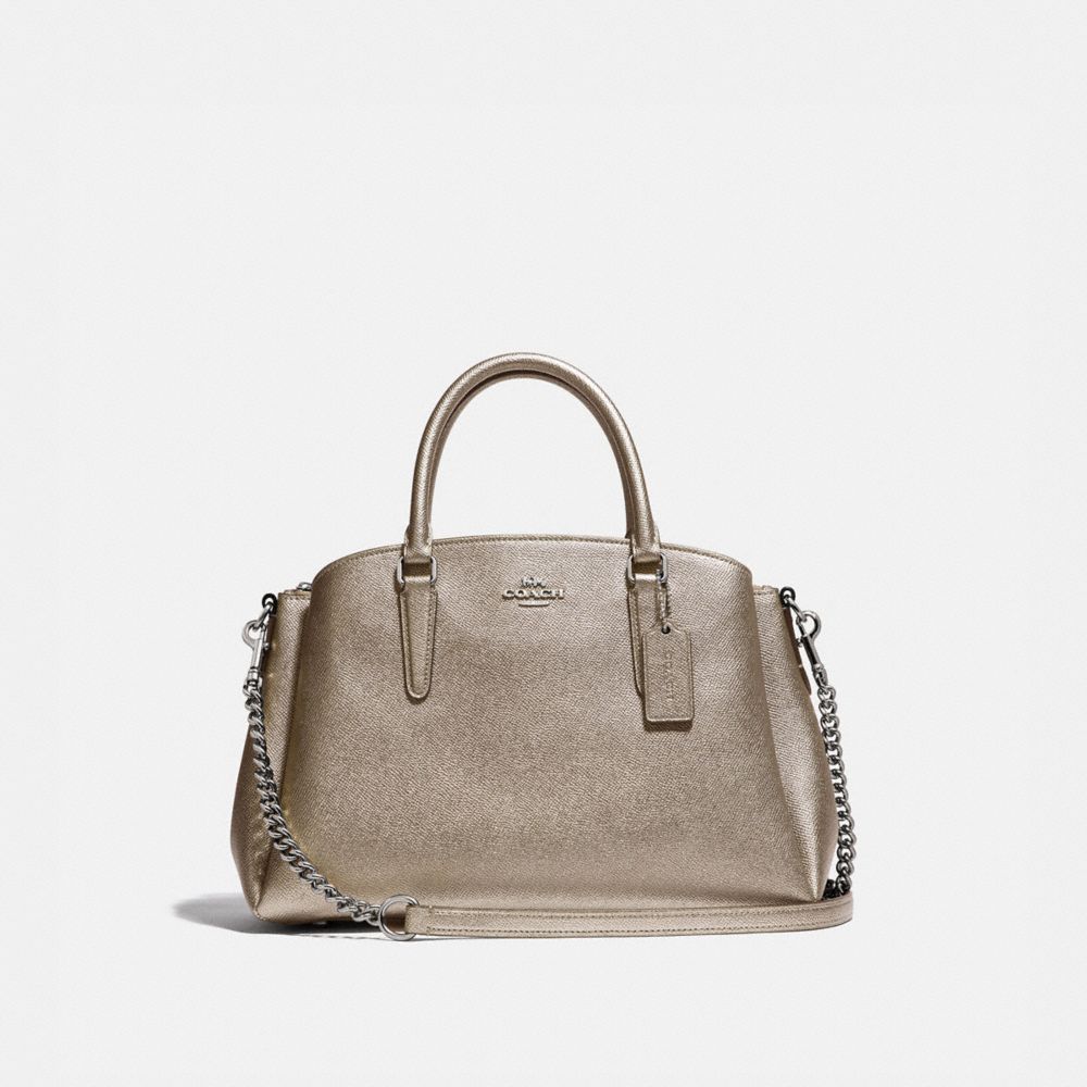Metallic crossgrain leather| Inside multifunction pocket| Center zip compartment| Snap closure, fabric lining| Handles with 4" drop| Detachable strap with 20" drop for shoulder or crossbody wear| 11 1/2" (L) x 8 3/4" (H) x 5" (W)