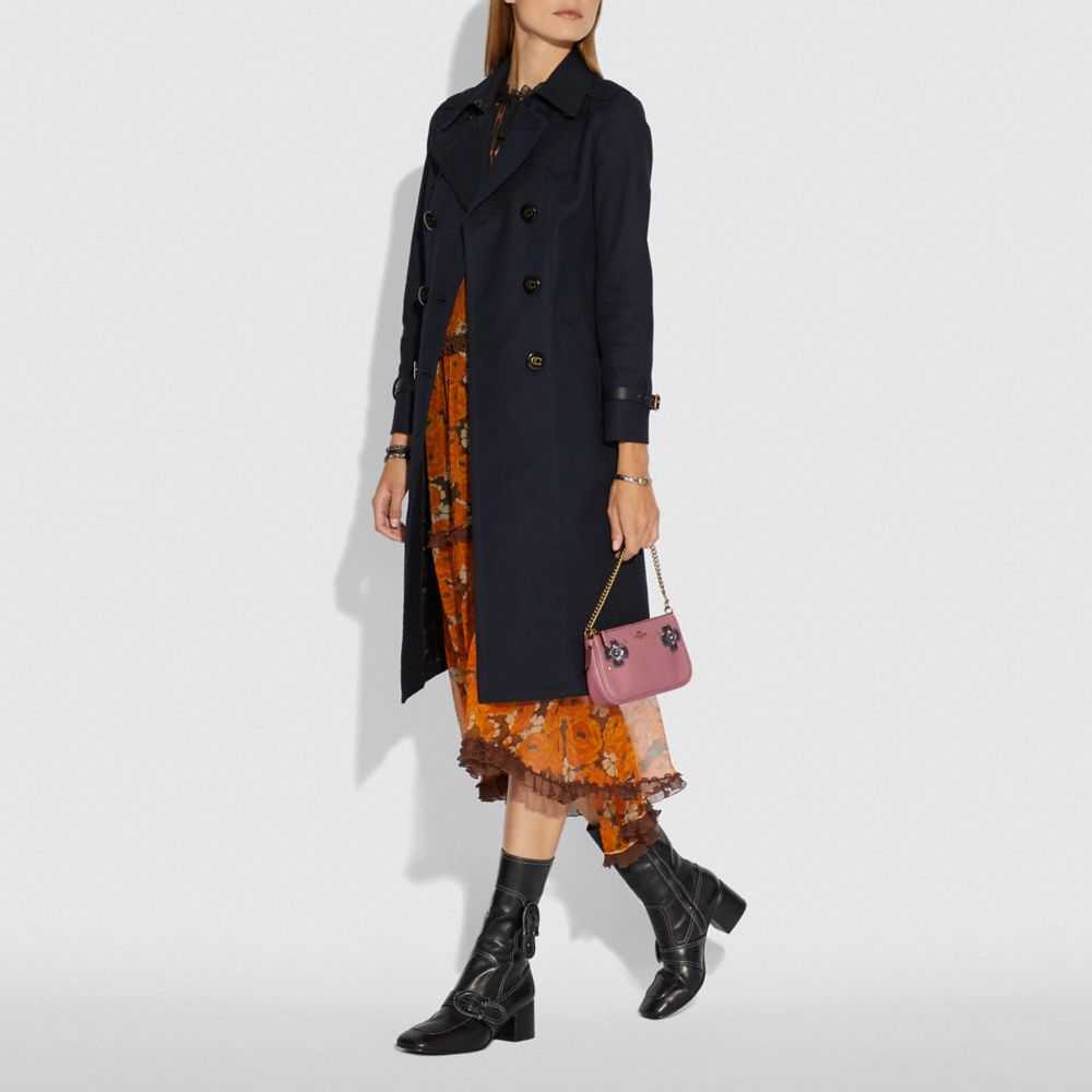 Polished pebble leather| Two credit card slots| Inside open pocket| Zip-top closure, fabric lining| Attached chain strap with dogleash clip| 7 1/2" (L) x 4 1/2" (H) x 2" (W)