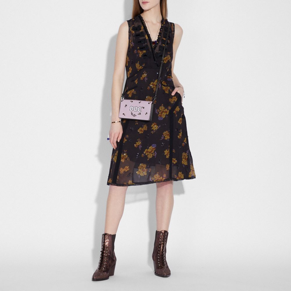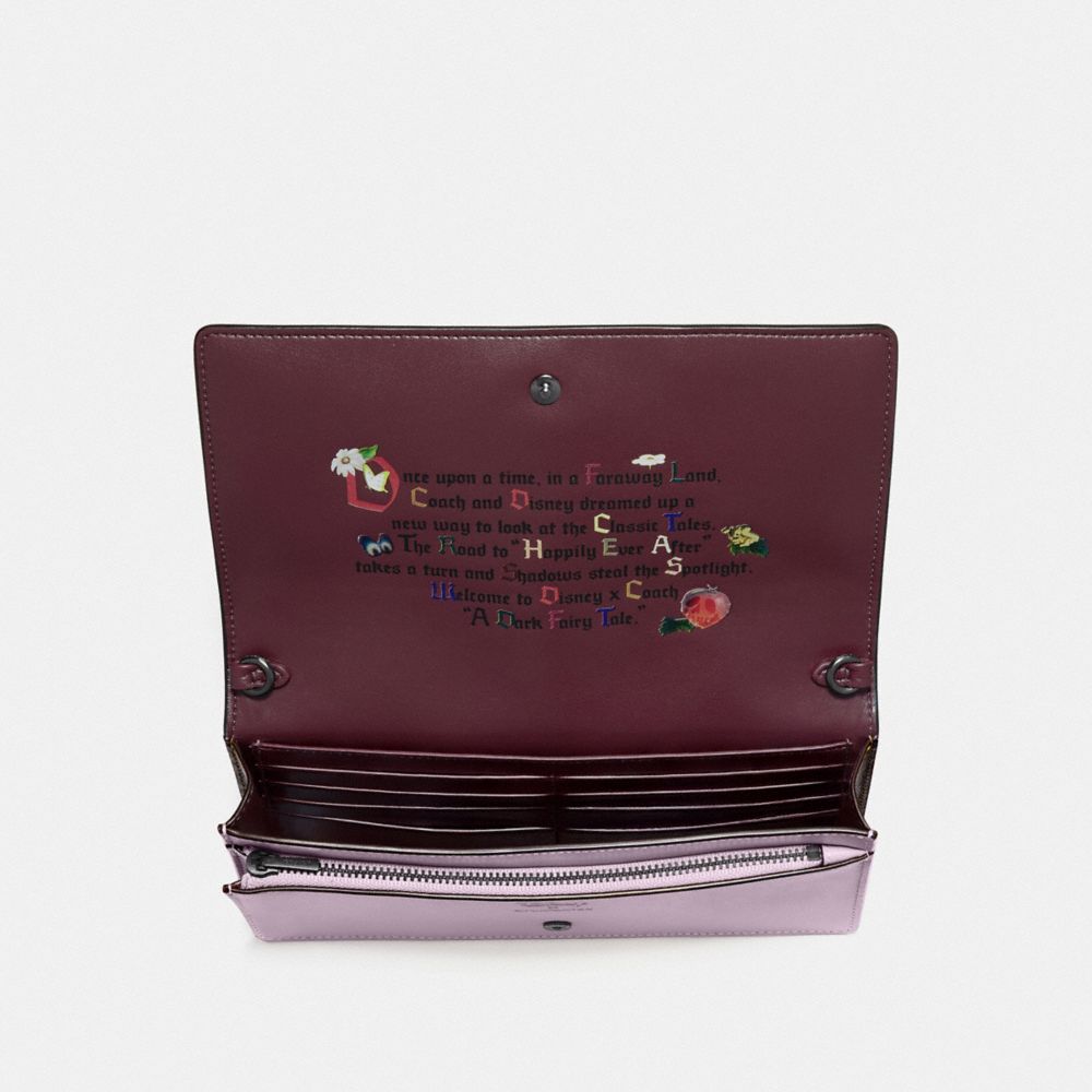 Refined calf leather| Eight credit card slots| Full-length bill compartment| Inside zip pocket| Snap closure| Outside slip pocket| Detachable strap with 23" drop for shoulder or crossbody wear| 8" (L) x 4 3/4" (H) x 1 1/2" (W)| Disney x Coach: A Dark Fairy Tale| ©Disney