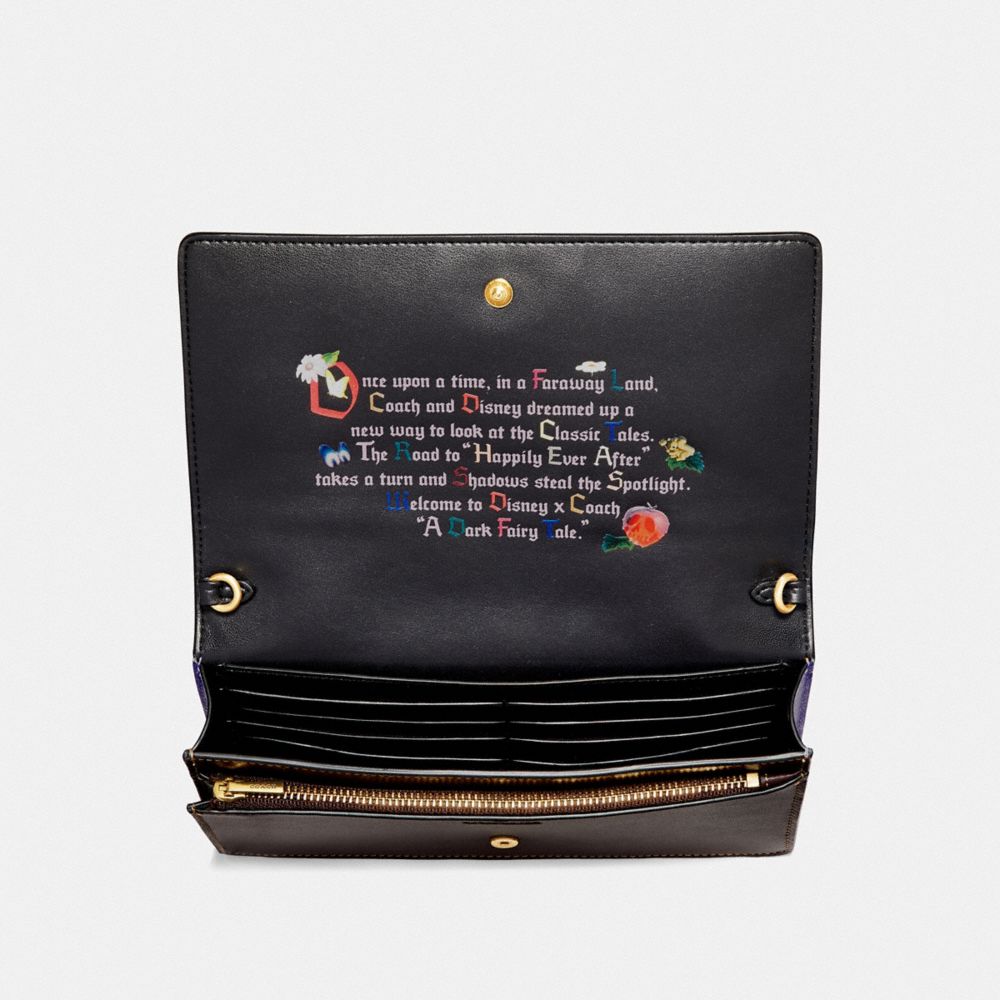 Refined calf leather| Eight credit card slots| Full-length bill compartment| Inside zip pocket| Snap closure| Outside slip pocket| Detachable strap with 23" drop for shoulder or crossbody wear| 8" (L) x 4 3/4" (H) x 1 1/2" (W)| Disney x Coach: A Dark Fairy Tale| ©Disney