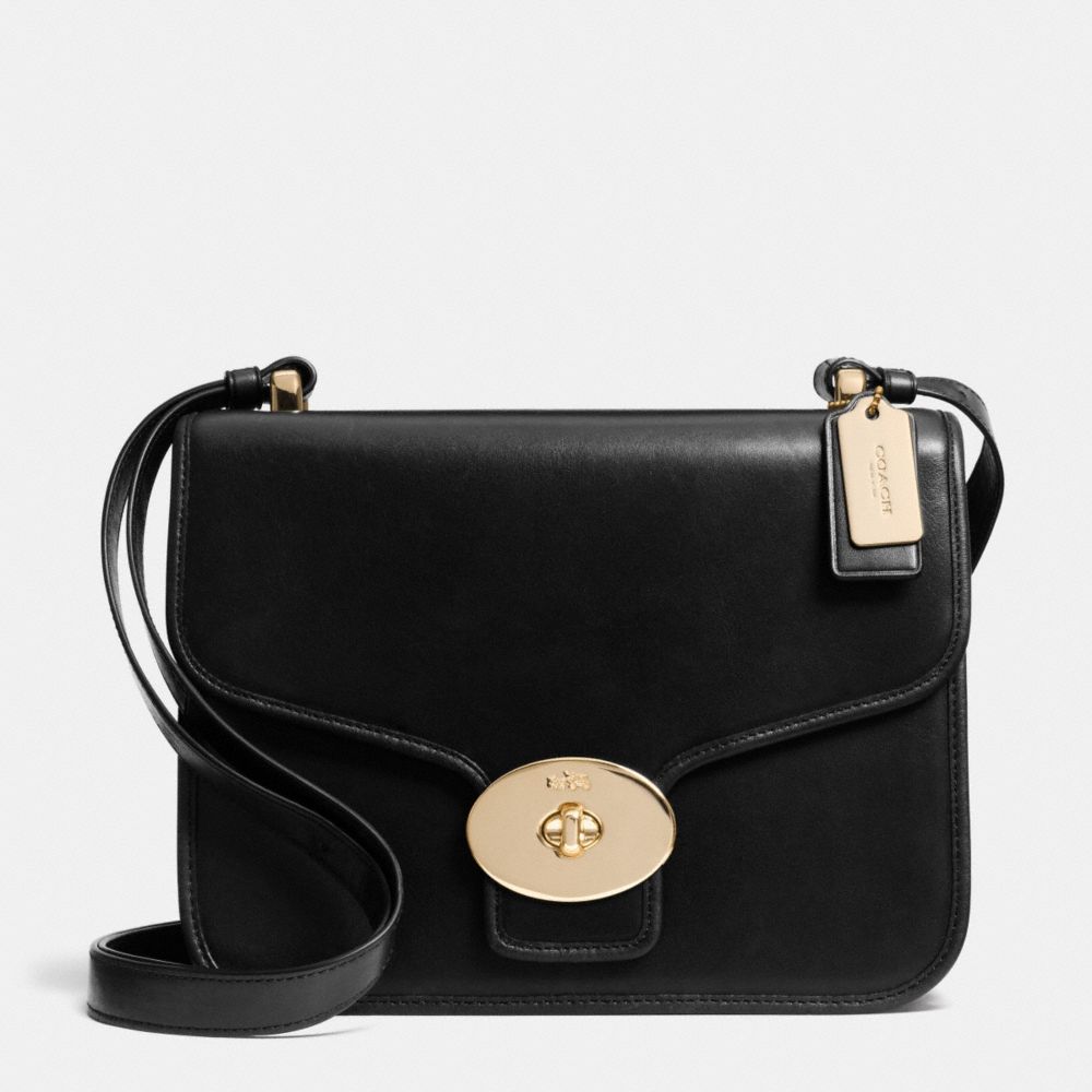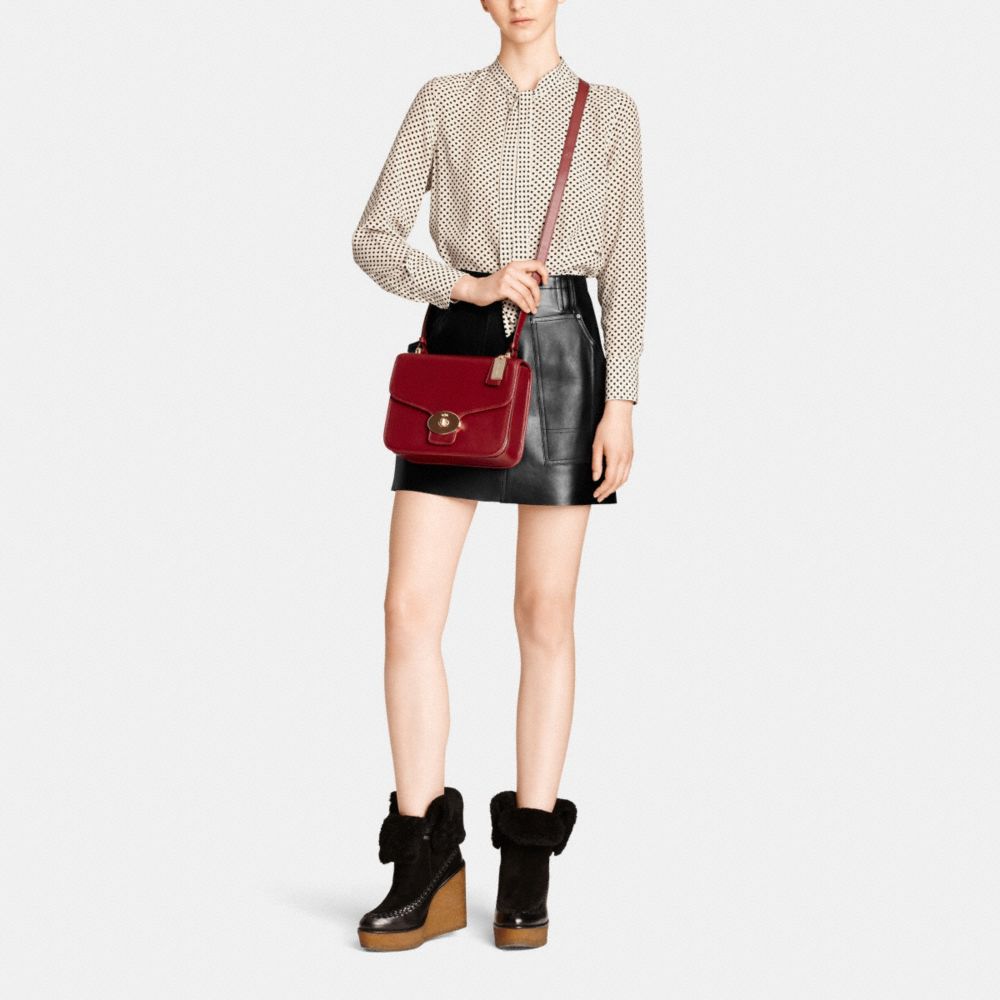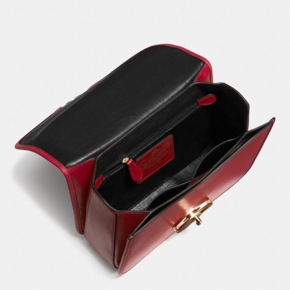 Details| | | Leather| Inside zip pocket| Turnlock closure, fabric lining| Outside open pocket| 12 1/2" (L) x 8 1/2" (H) x 3 1/2" (W)