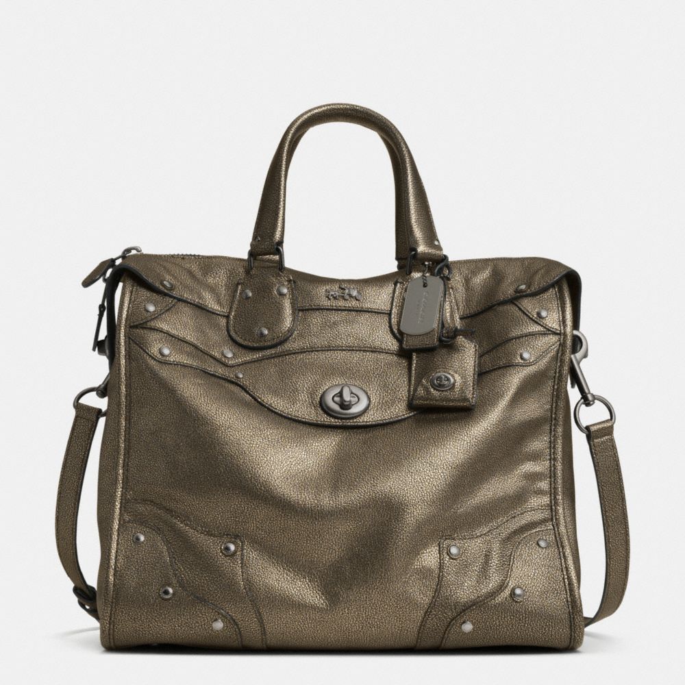 Details| | | Metallic leather Inside zip, cell phone and multifunction pockets Zip closure, fabric lining Outside turnlock pocket Handles with 4 3/4 drop Longer strap with 19 1/2 drop for shoulder wear 13 (L) x 11 1/2 (H) x 7 3/4 (W)