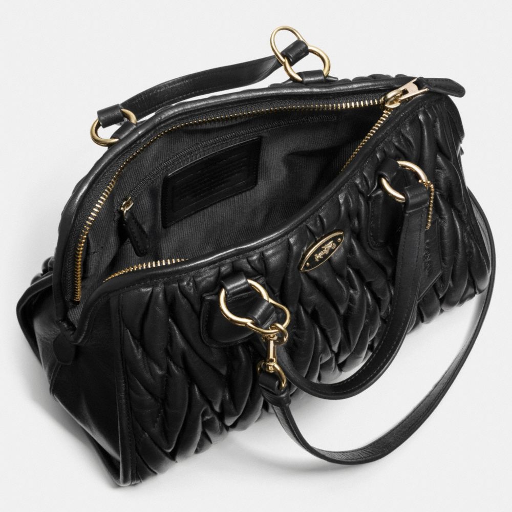 Details| | | Gathered leather Inside zip, cell phone and multifunction pockets Zip-top closure, fabric lining Handles with 4 drop Longer strap with 21 1/2 drop for shoulder wear 11 (L) x 6 3/4 (H) x 5 (W)