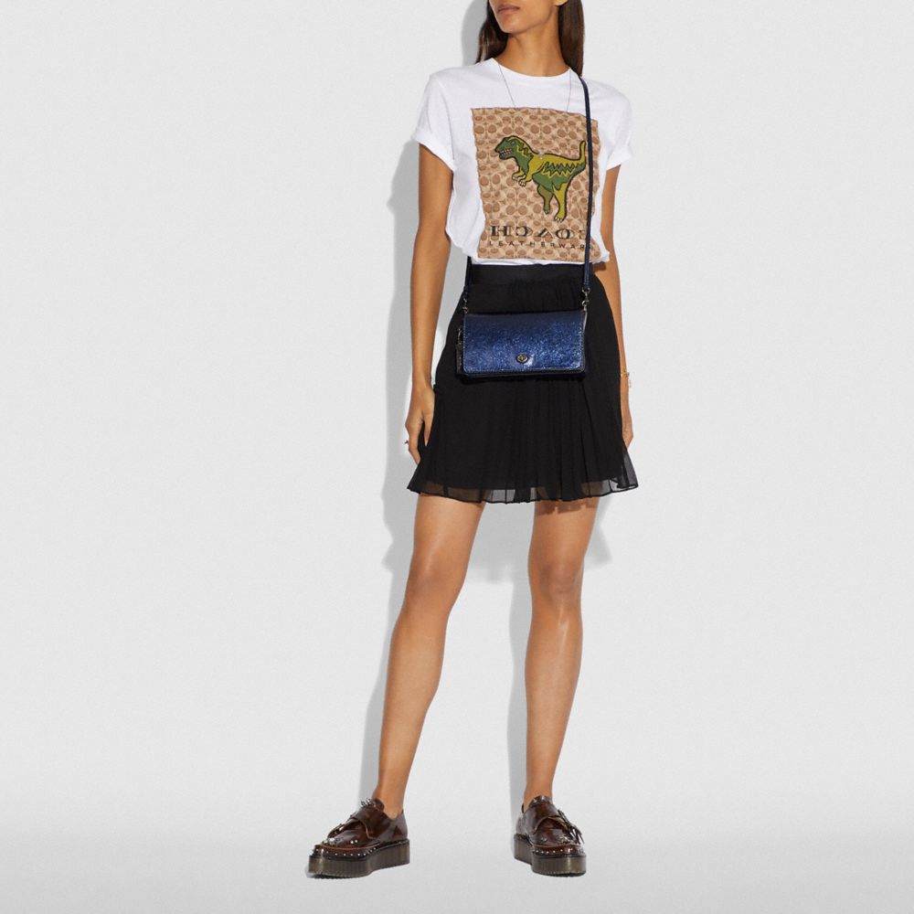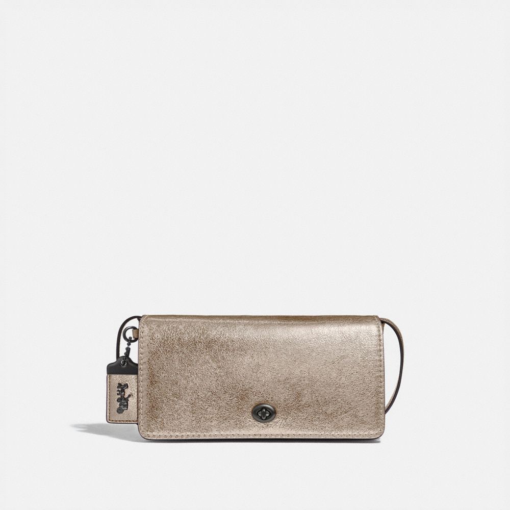 Metallic crinkle leather| Inside open and coin purse pockets| Turnlock closure, leather lining| Outside slip pocket| Detachable strap with 22" drop doubles up for three ways to wear: short or long on the shoulder or crossbody style| 9" (L) x 5" (H) x 2" (W)