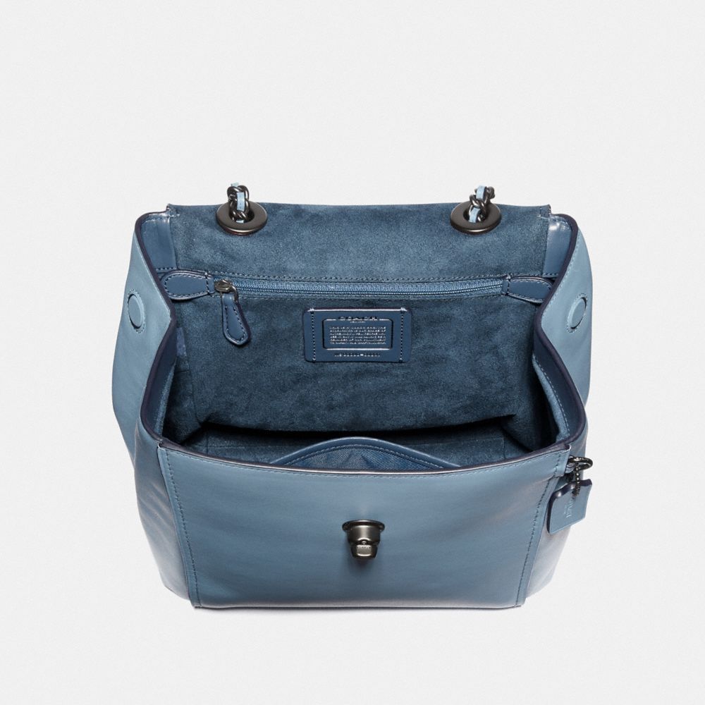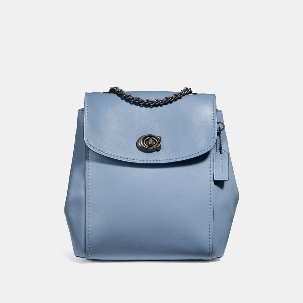 Refined calf leather| Inside zip and multifunction pockets| Turnlock closure, fabric lining| Outside zip pocket| Adjustable straps convert bag to a shoulder bag from a backpack| 9 1/4" (L) x 10 3/4" (H) x 5" (W)