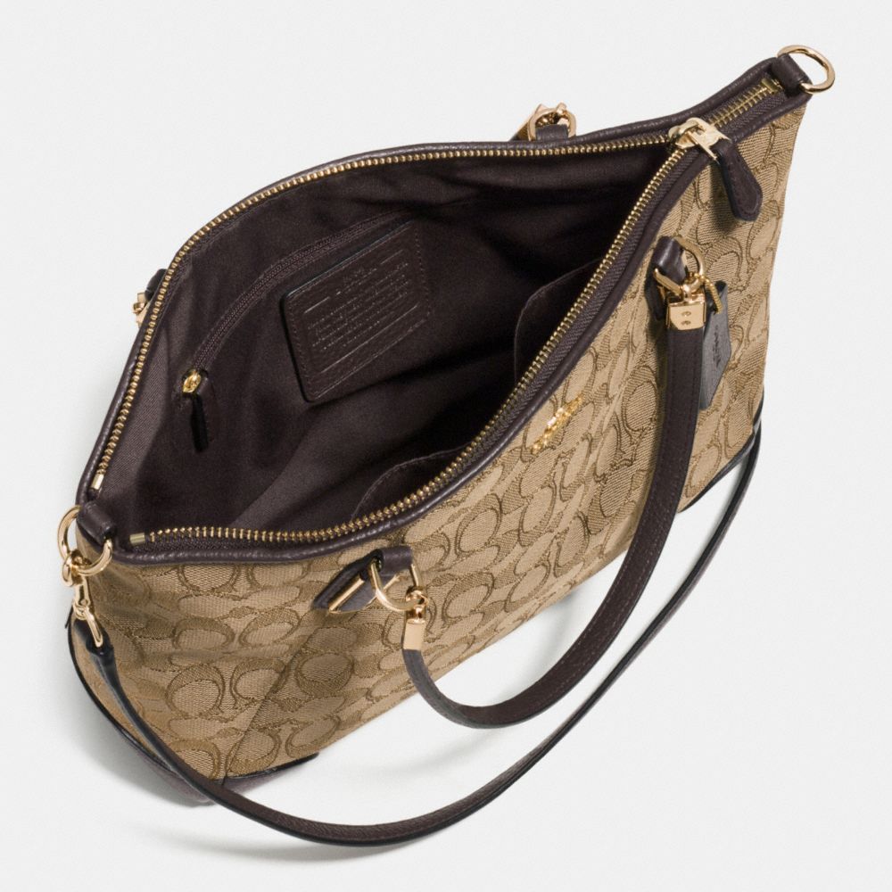 Details| | | Signature canvas with leather trim | Inside zip, cell phone and multifunction pockets| Zip-top closure, fabric lining| Handles with 5" drop| Long strap with 20" drop for shoulder or crossbody wear| 12" (L) x 9" (H) x 3" (W)