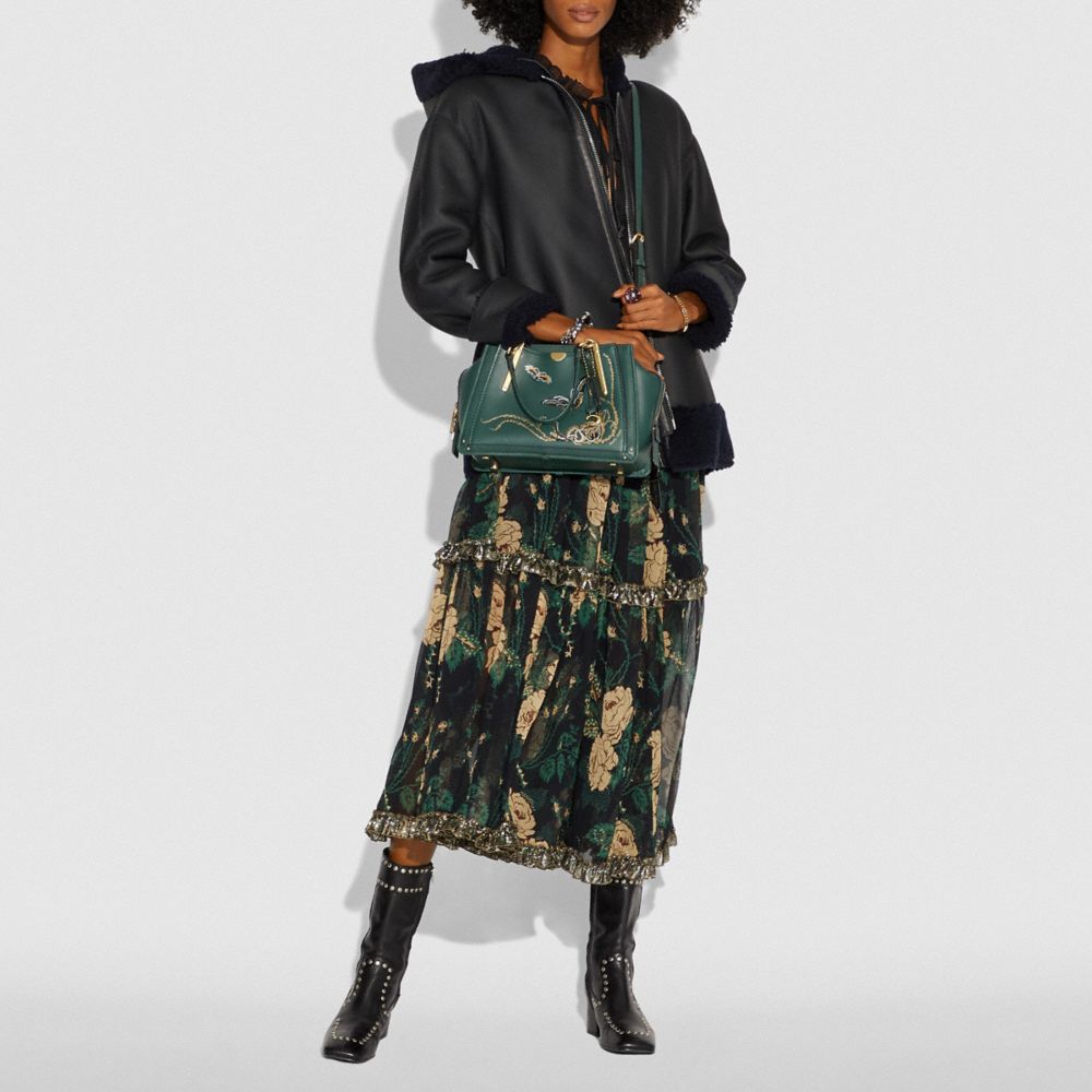 Smooth leather| Inside zip and multifunction pockets| Zip closure, fabric lining| Side snap pockets| Handles with 5 3/4" drop| Detachable strap with 21 1/2" drop for shoulder or crossbody wear| 11 1/2" (L) x 7 1/2" (H) x 4 1/4" (W)