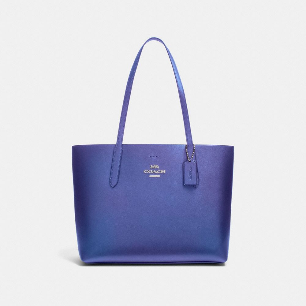 Metallic double face leather| Inside zip pocket| Snap closure| Handles with 10" drop| 13 3/4" (L) x 11" (H) x 5" (W)