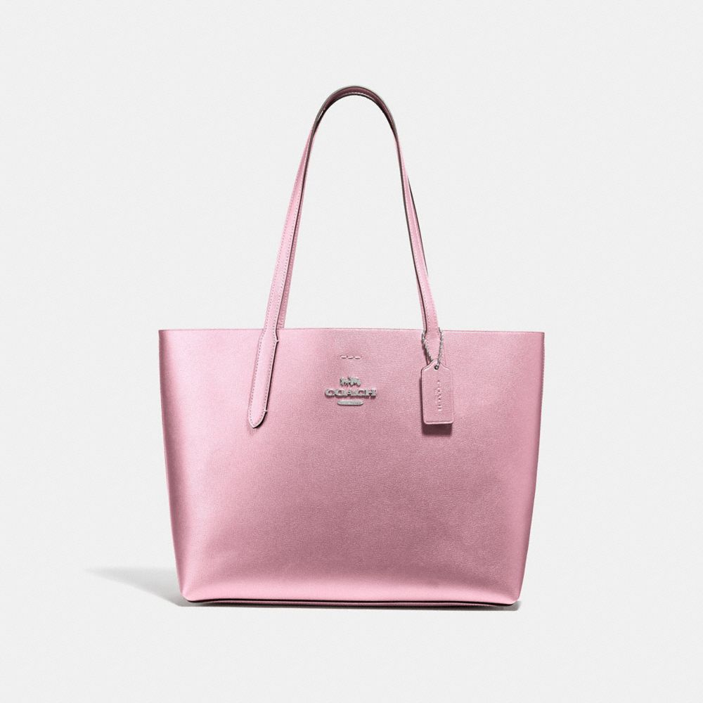 Metallic double face leather| Inside zip pocket| Snap closure| Handles with 10" drop| 13 3/4" (L) x 11" (H) x 5" (W)
