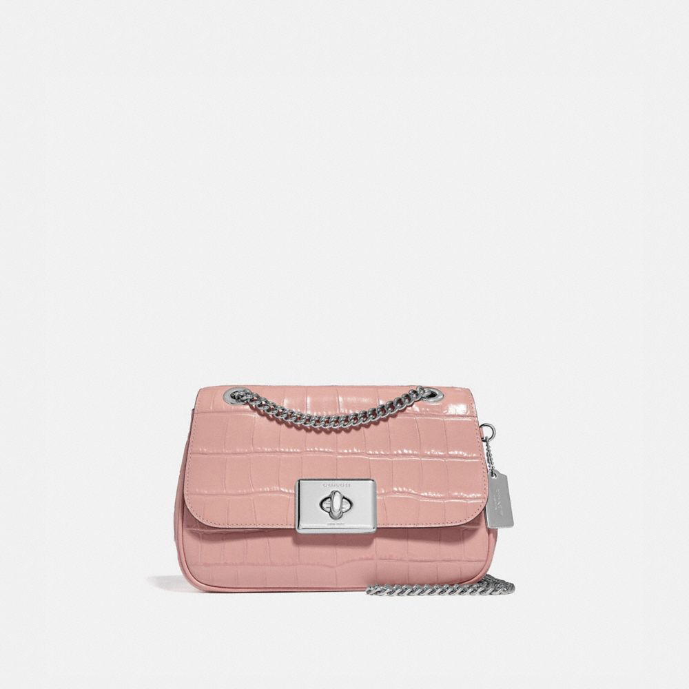 | Crocodile-embossed leather and smooth leather| Inside multifunction pockets| Turnlock closure, fabric lining| Handles convert to shoulder strap with 22 1/2" drop| Outside slip pocket| 9 1/2" (L) x 6 1/4" (H) x 3 1/4" (W)