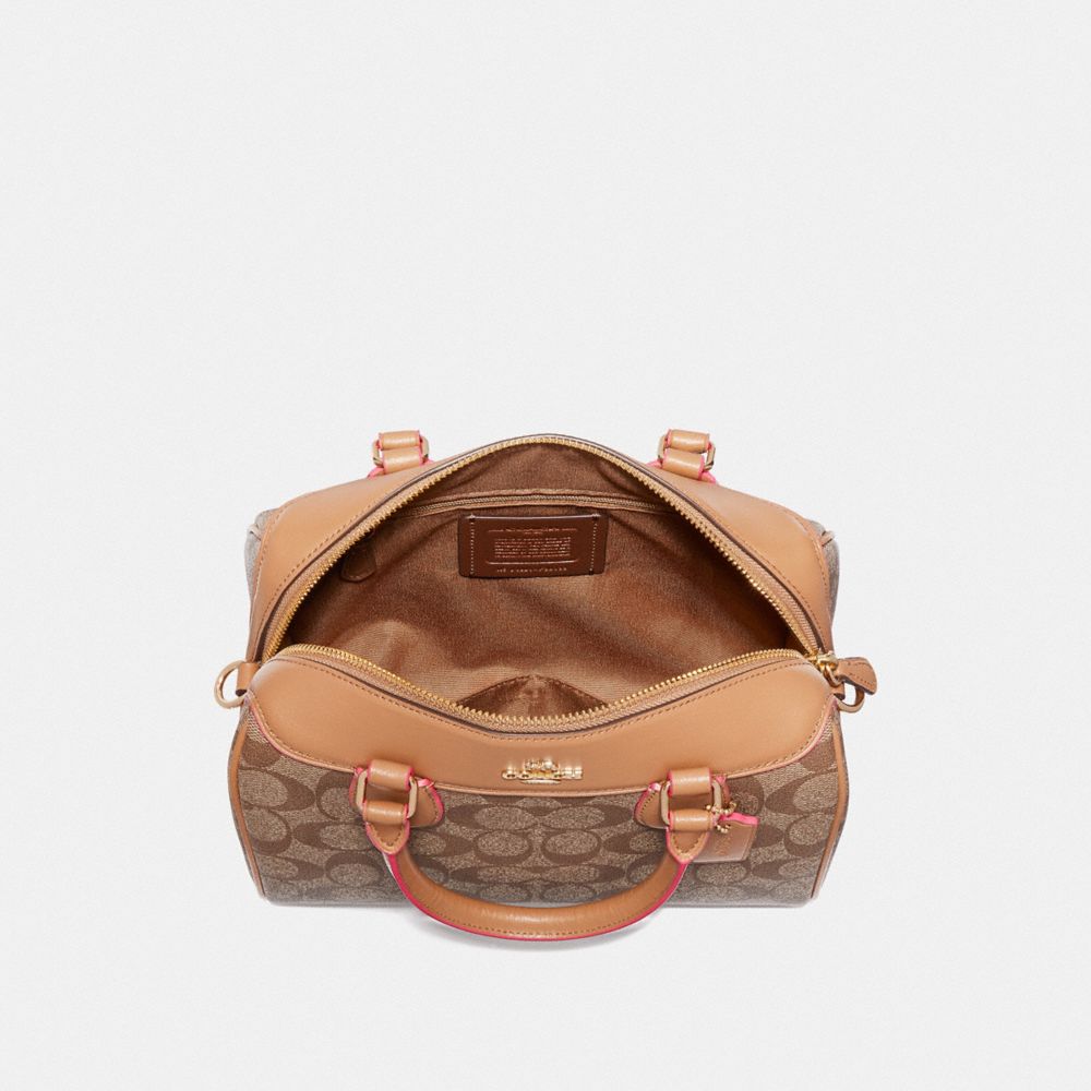 Signature coated canvas with smooth leather details| Inside zip and multifunction pockets| Zip-top closure, fabric lining| Handles with 4" drop| Detachable strap with 23" drop for shoulder or crossbody wear| 9" (L) x 6 1/2" (H) x 5" (W)