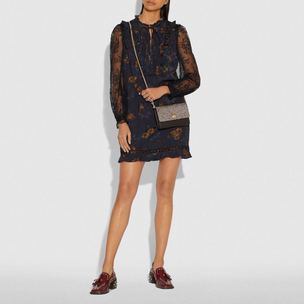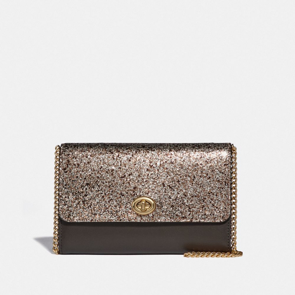 Glitter and refined calf leather| Two credit card slots| Inside open and zip pockets| Turnlock closure, fabric lining| Outside open pocket| Detachable chain strap with 22" drop for shoulder or crossbody wear| 7 3/4" (L) x 5" (H) x 1 1/4" (W)