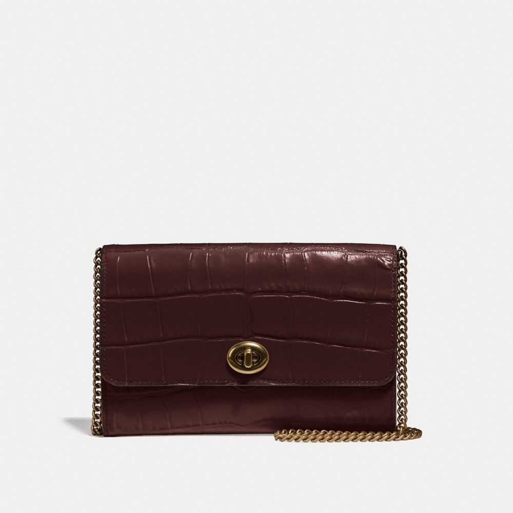 Crocodile-embossed leather| Two credit card slots| Inside open and zip pockets| Turnlock closure, fabric lining| Outside open pocket| Detachable chain strap with 22" drop for shoulder or crossbody wear| 7 3/4" (L) x 5" (H) x 1 1/4" (W)