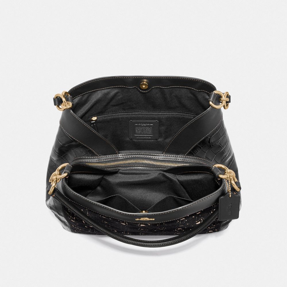 | Flocked fabric, refined calf leather and crocodile-embossed leather| Inside zip, cell phone and multifunction pockets| Center zip compartment| Snap closure, fabric lining| Handles with 9 1/2" drop| 13" (L) x 10 3/4" (H) x 5" (W)
