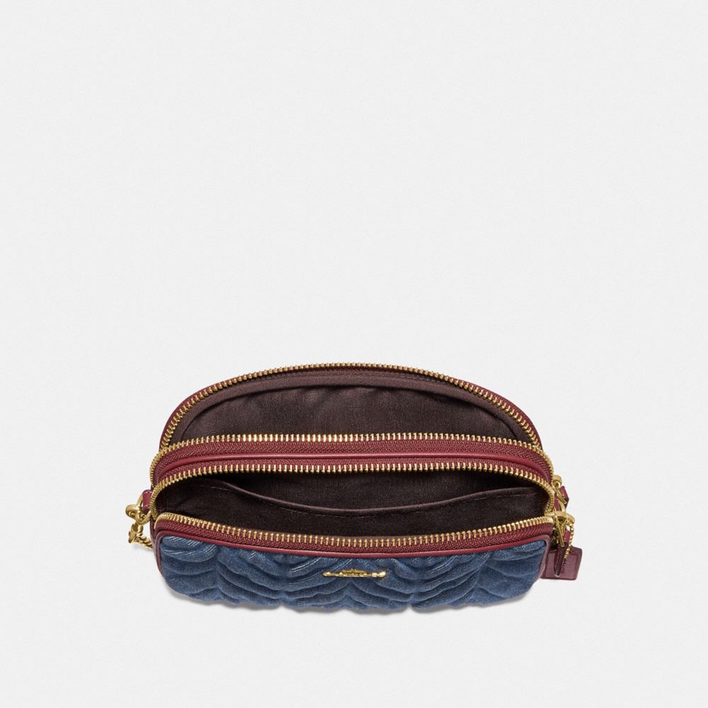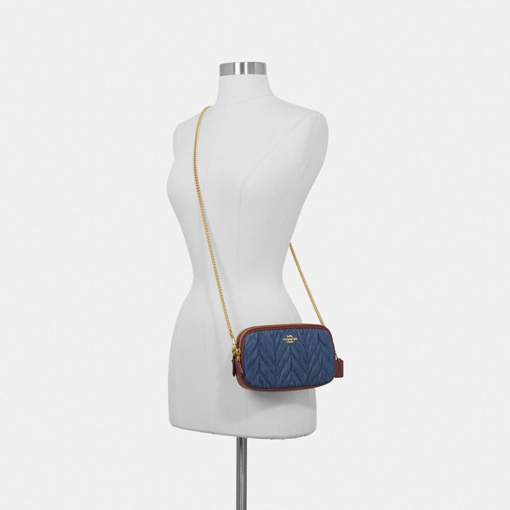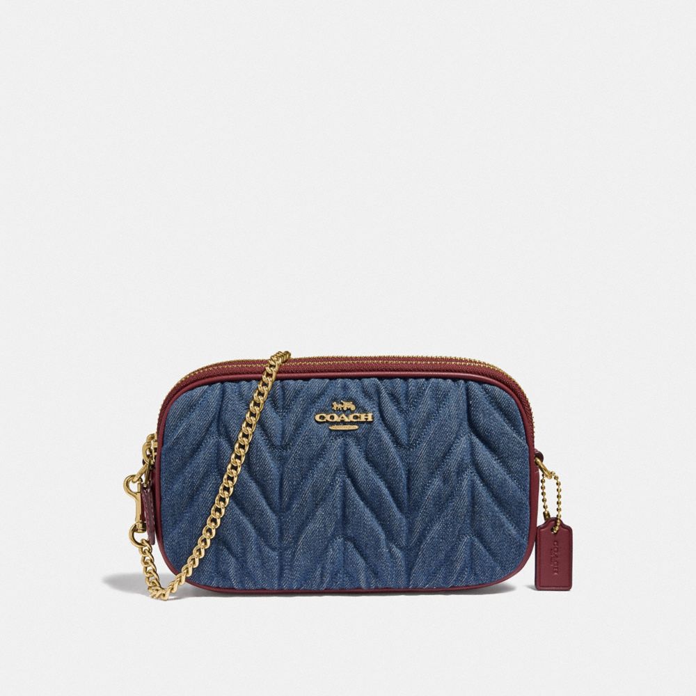 | Denim with smooth leather details| Two credit card slots| Inside multifunction pocket| Double zip closure, fabric lining| Detachable strap with 23" drop for shoulder or crossbody wear| 7 1/2" (L) x 4 1/2" (H) x 1 1/2" (W)