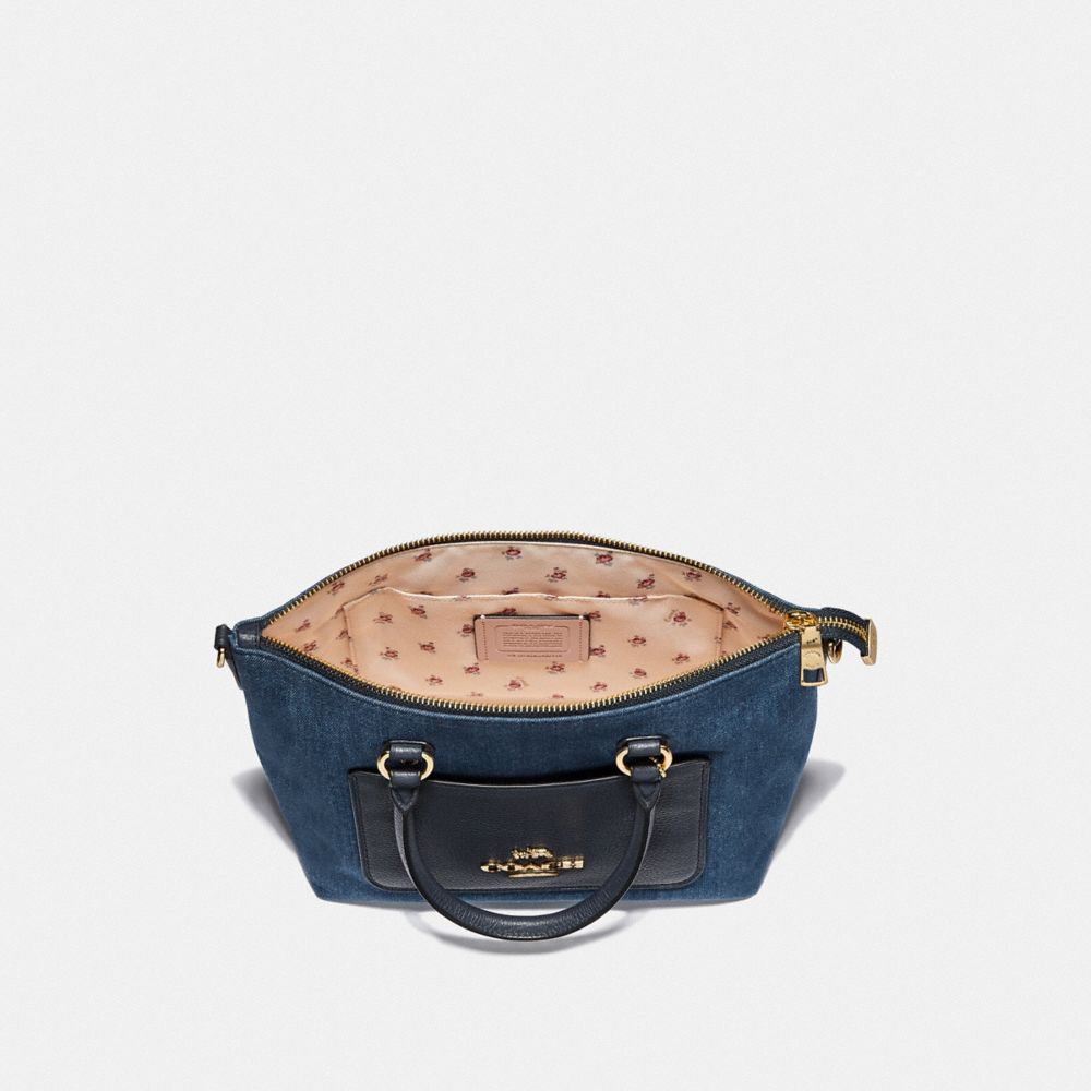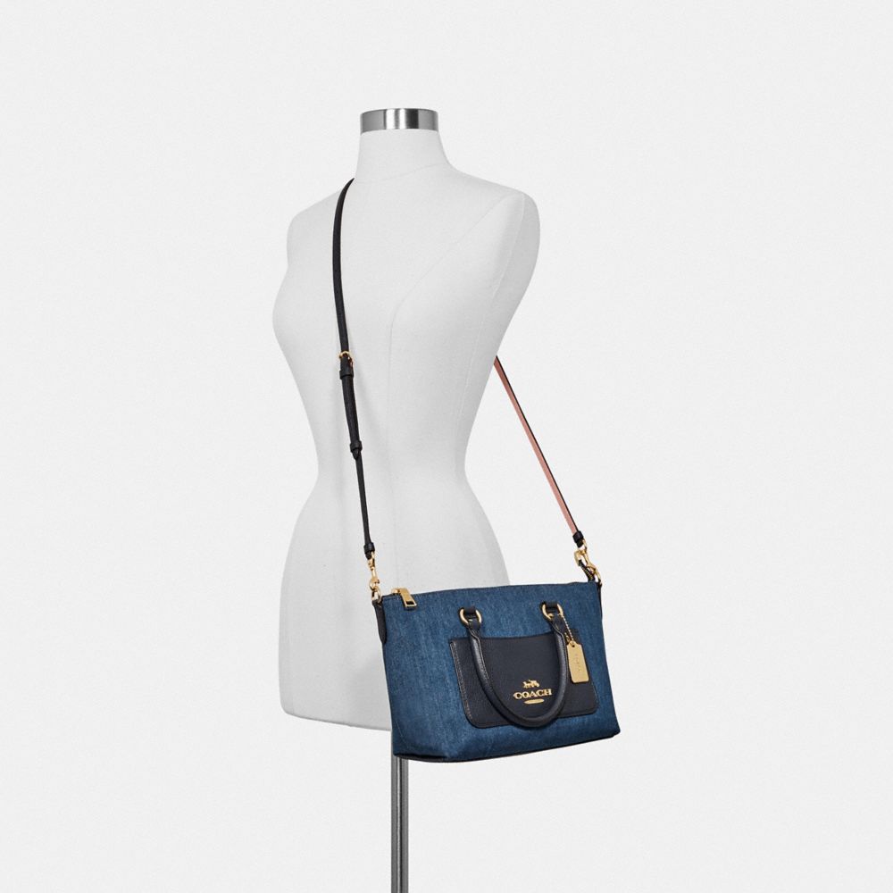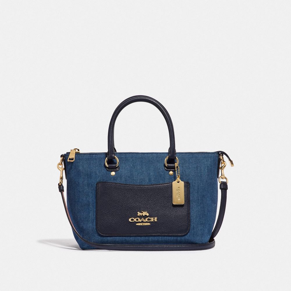 | Denim with refined pebble leather details| Inside multifunction pocket| Zip-top closure, fabric lining| Handles with 4" drop| Outside slip pocket| Detachable strap with 22" drop for shoulder or crossbody wear| 11 3/4" (L) x 7 1/2" (H) x 4 3/4" (W)