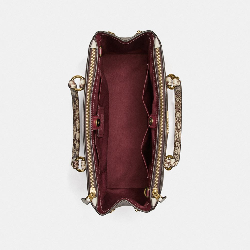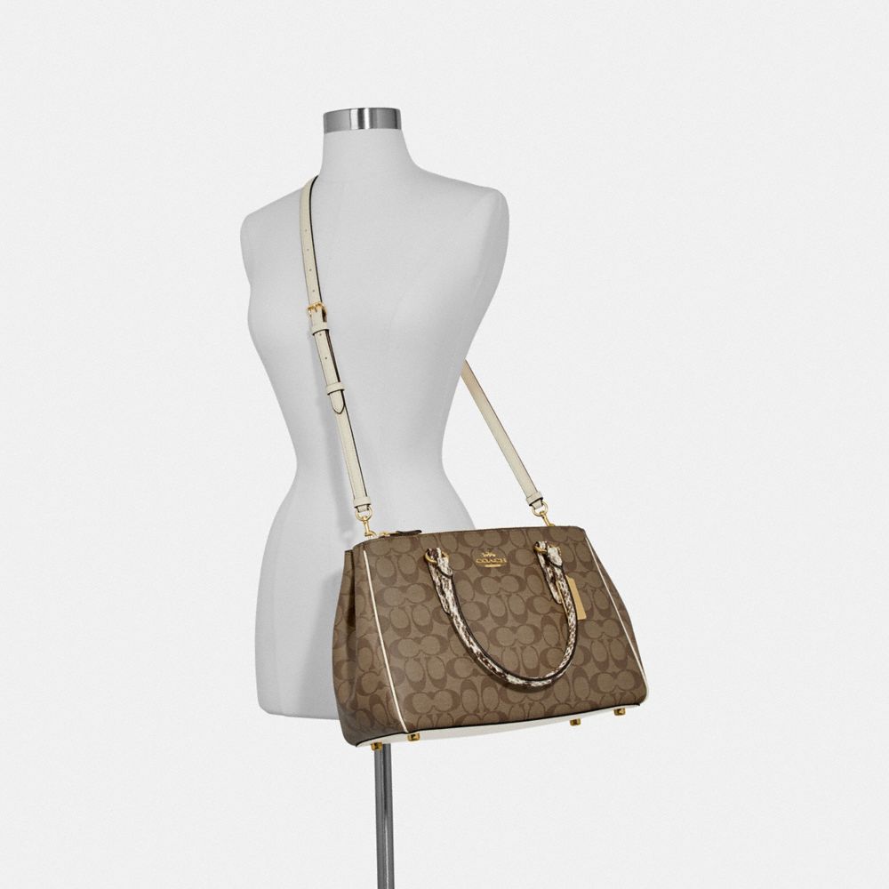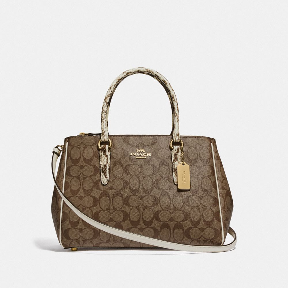 | Signature coated canvas, snake-embossed leather and smooth leather| Inside cell phone and multifunction pockets| Snap closure, fabric lining| Side zip compartments| Handles with 5 1/2" drop| Detachable strap with 20 1/2" drop for shoulder or crossbody wear| 12 3/4" (L) x 9" (H) x 6" (W)