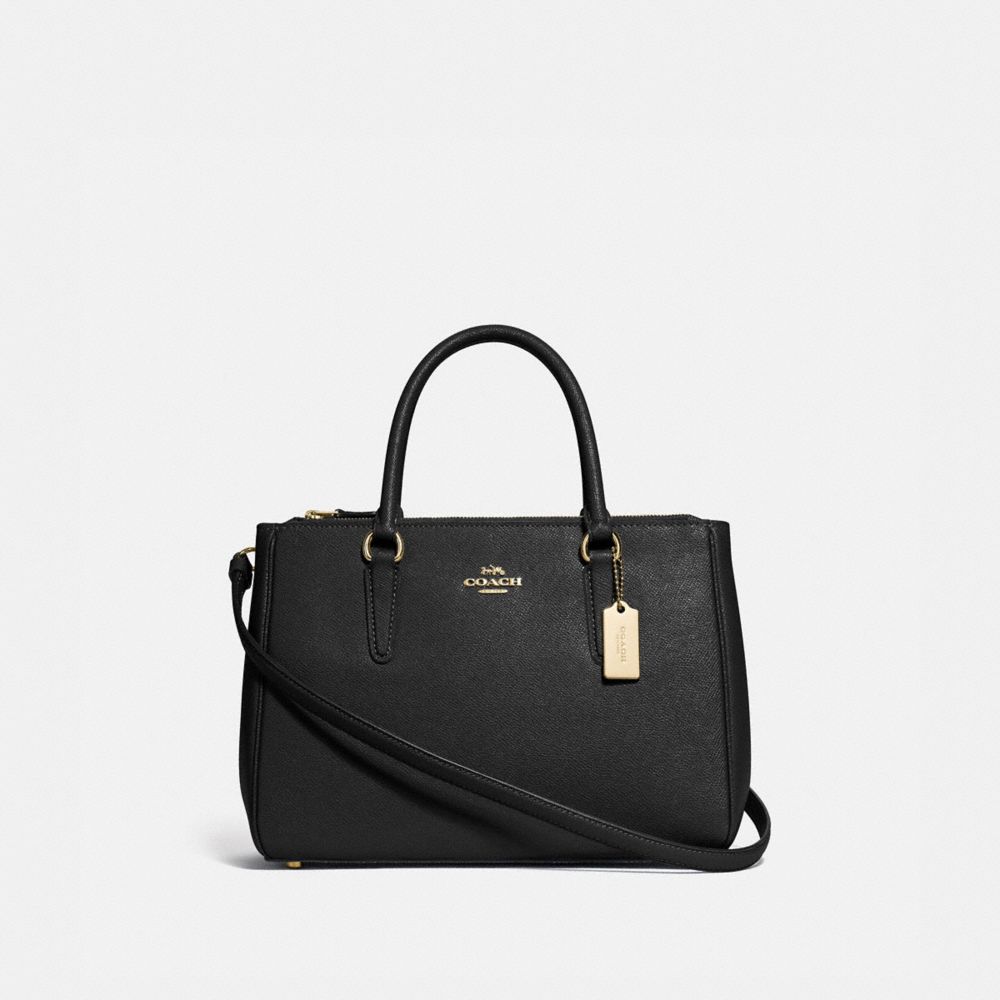 | Crossgrain leather| Inside cell phone and multifunction pockets| Snap closure, fabric lining| Side zip compartments| Handles with 4 1/4" drop| Detachable strap with 20 1/2" drop for shoulder or crossbody wear| 11 1/4" (L) x 8" (H) x 5" (W)