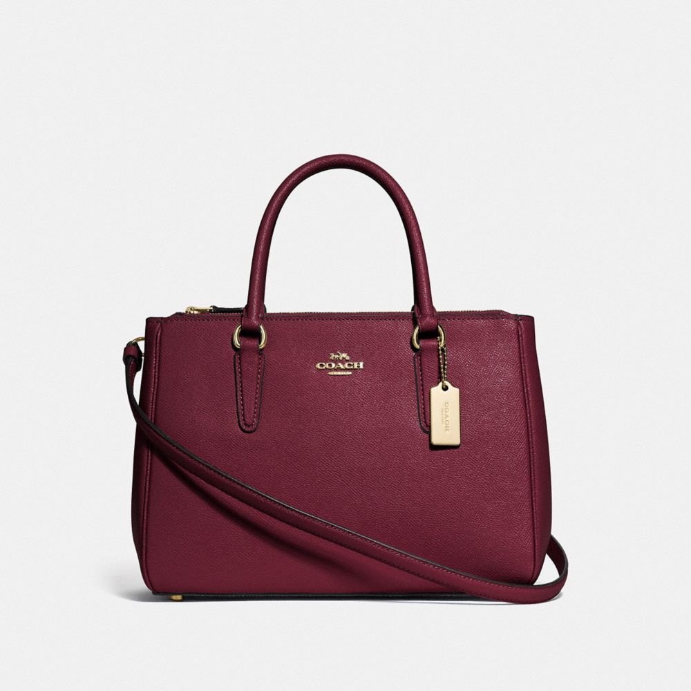 | Crossgrain leather| Inside cell phone and multifunction pockets| Snap closure, fabric lining| Side zip compartments| Handles with 4 1/4" drop| Detachable strap with 20 1/2" drop for shoulder or crossbody wear| 11 1/4" (L) x 8" (H) x 5" (W)