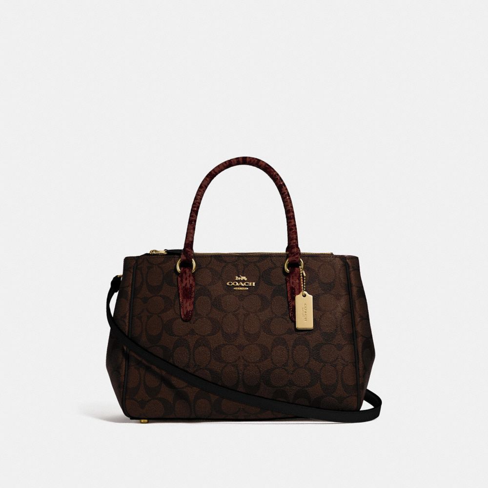 | Signature coated canvas, snake-embossed leather and smooth leather| Inside cell phone and multifunction pockets| Snap closure, fabric lining| Side zip compartments| Handles with 4 1/4" drop| Detachable strap with 20 1/2" drop for shoulder or crossbody wear| 11 1/4" (L) x 8" (H) x 5" (W)