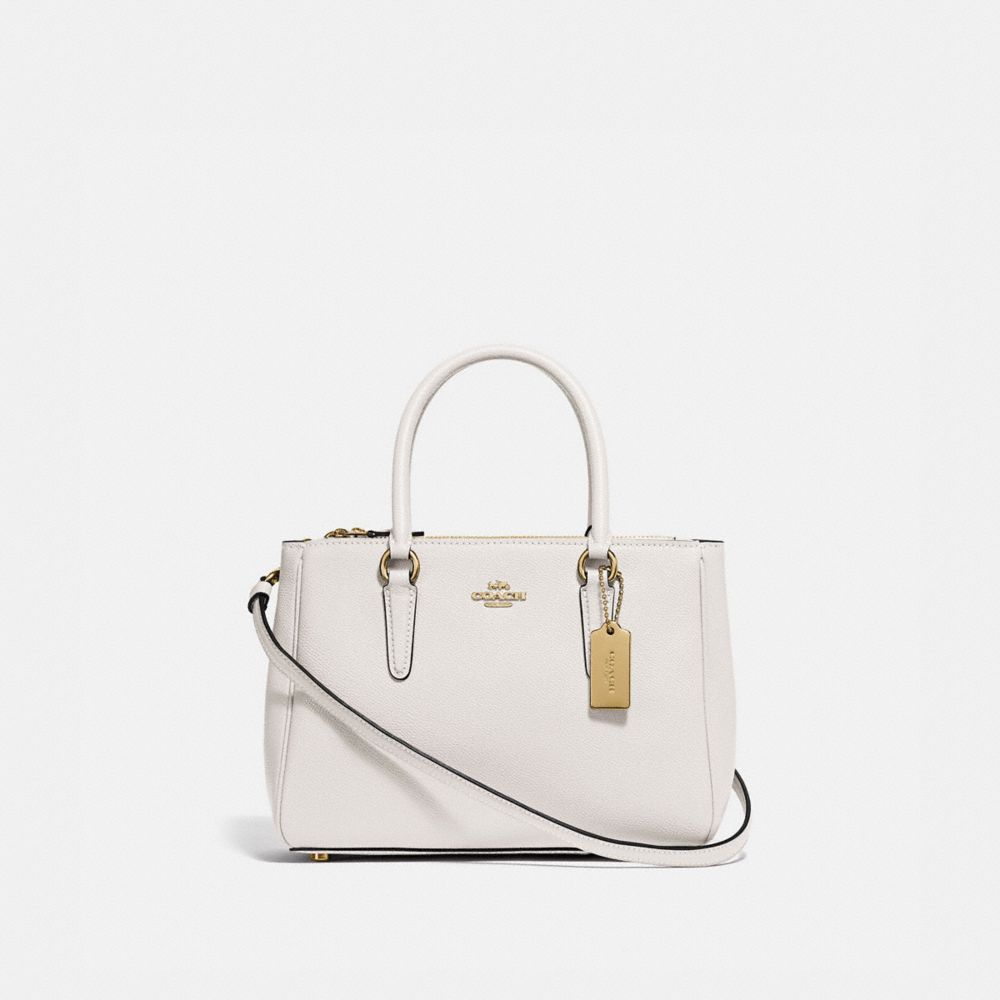 | Crossgrain leather| Inside multifunction pockets| Snap closure, fabric lining| Side zip compartments| Handles with 4" drop| Detachable strap with 23" drop for shoulder or crossbody wear| 9 1/4" (L) x 6 3/4" (H) x 4 1/4" (W)