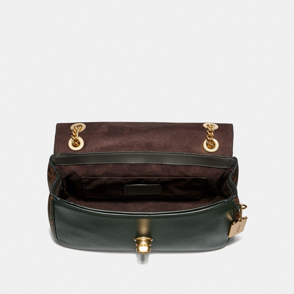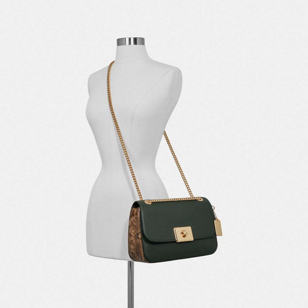 | Smooth leather with snake-embossed leather details| Inside multifunction pocket| Turnlock closure, fabric lining| Handles convert to shoulder strap with 20 1/2" drop| Outside slip pocket| 11" (L) x 7 1/2" (H) x 3 3/4" (W)