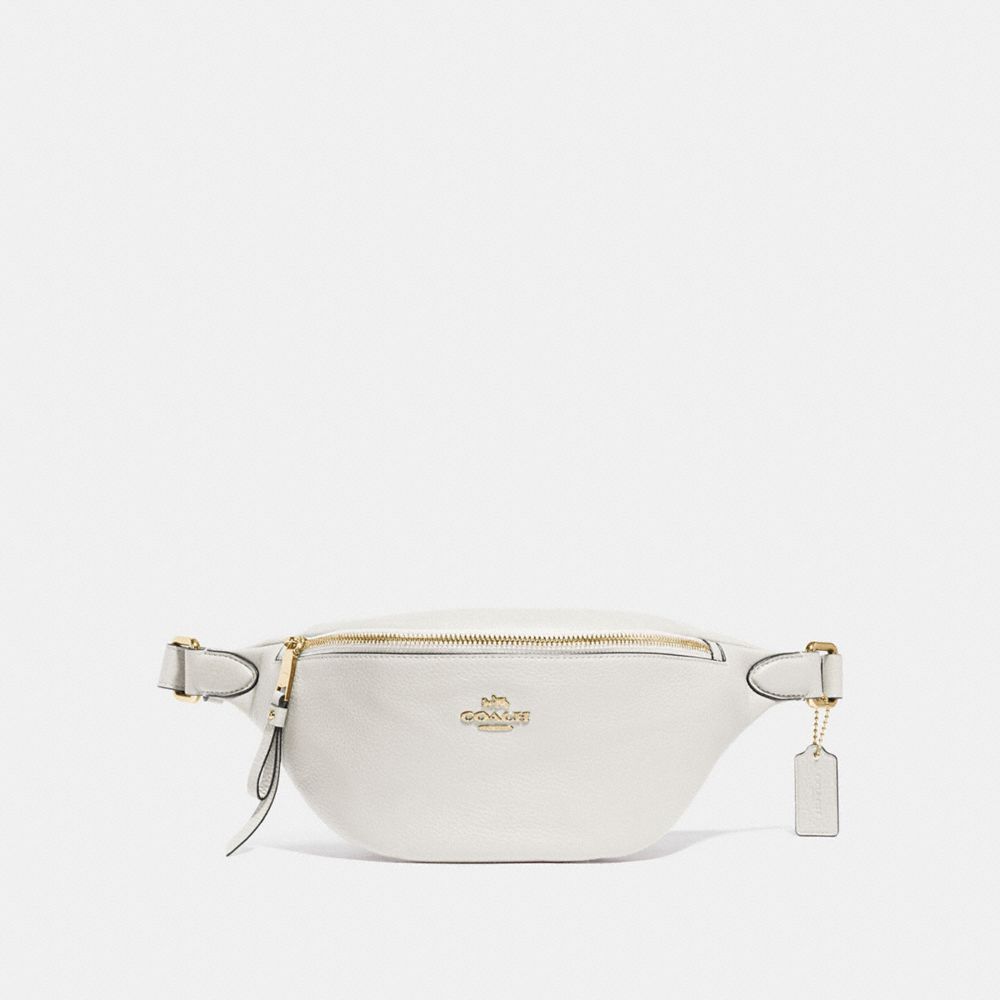 | Refined pebble leather| One credit card slot| Zip closure, fabric lining| Adjustable strap for wear at waist| 14 1/4" (L) x 5" (H) x 4 1/4" (W)