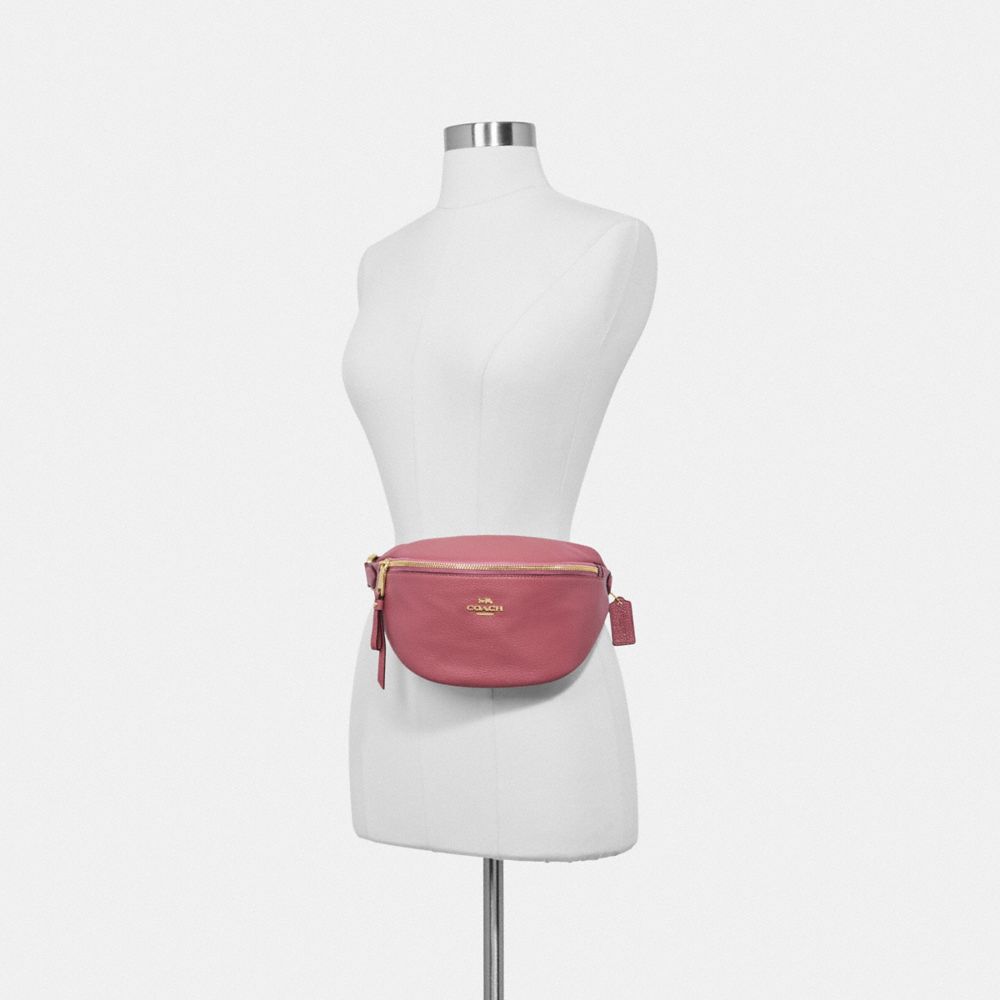 Refined pebble leather| One credit card slot| Zip closure, fabric lining| Adjustable strap for wear at waist| 14 1/4" (L) x 5" (H) x 4 1/4" (W)