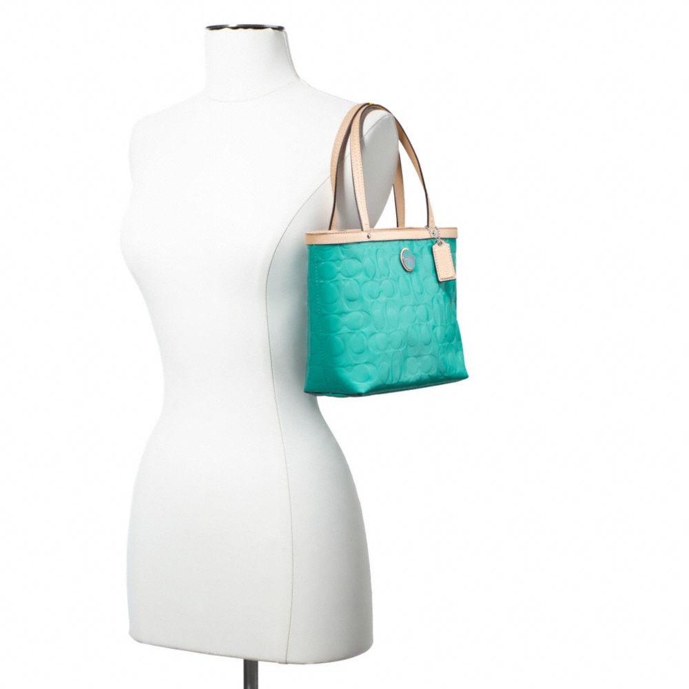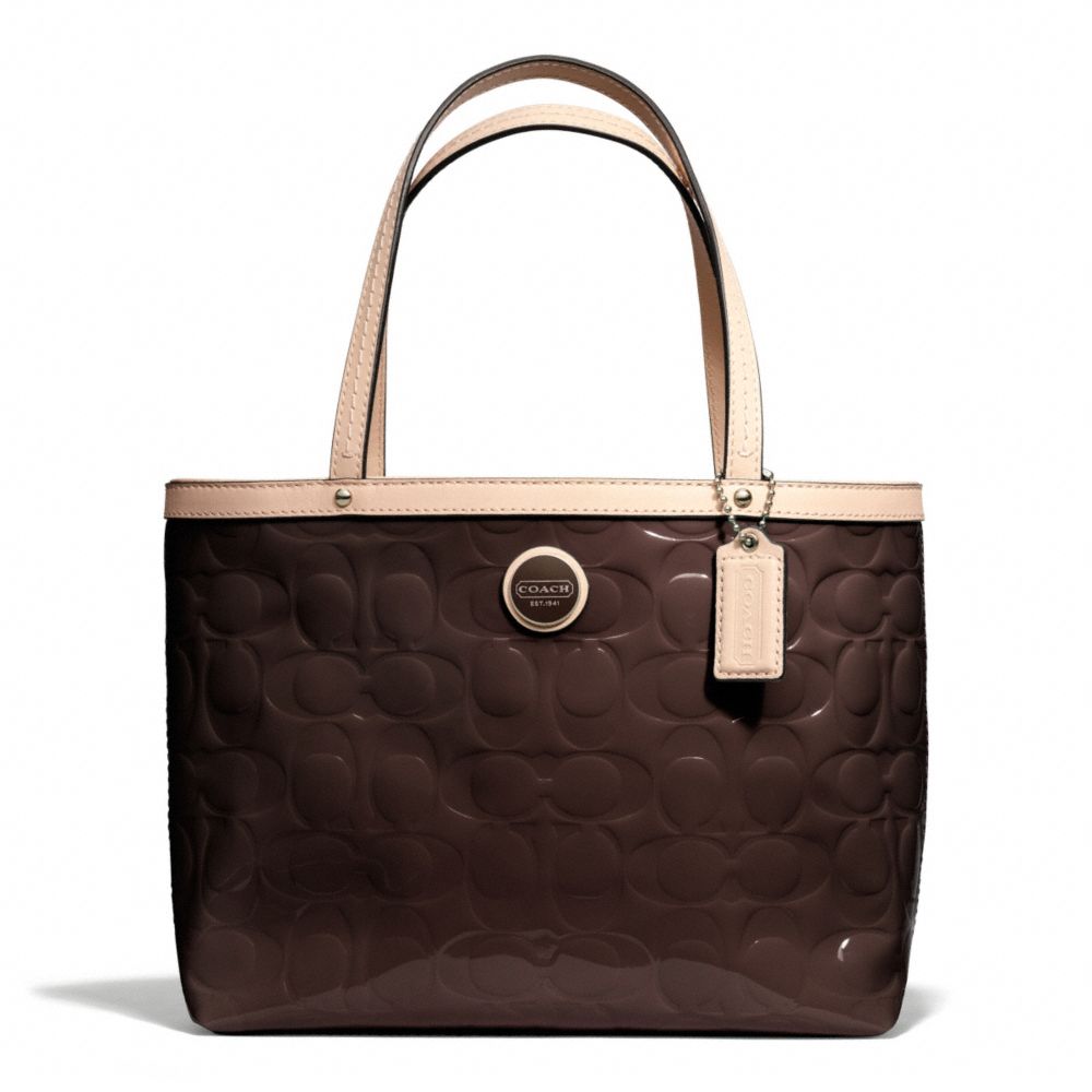 SIGNATURE STRIPE EMBOSSED PATENT TOP HANDLE TOTE