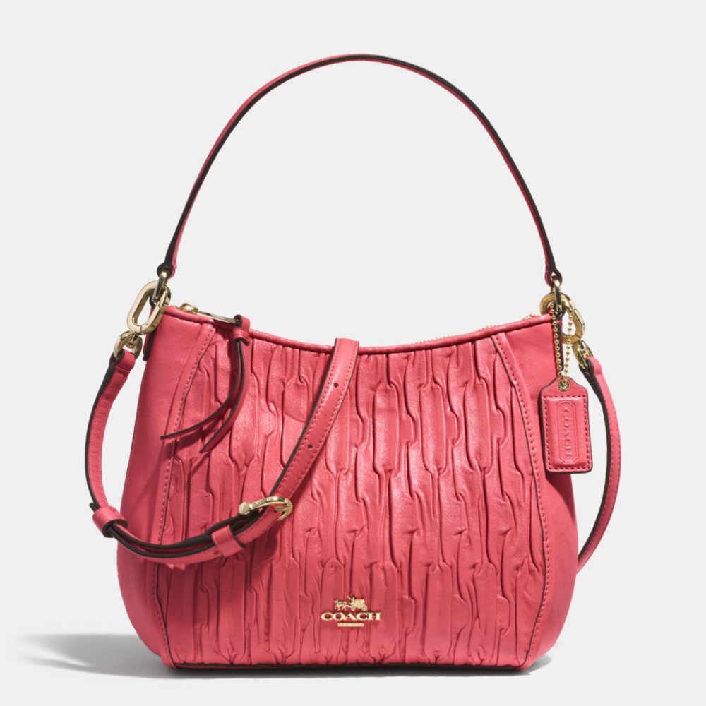 Details| | | Gathered leather| Inside zip, cell phone and multifunction pockets| Zip-top closure, fabric lining| Handles with 5 1/2" drop| Detachable strap with 22" drop for shoulder or crossbody wear| 8 3/4" (L) x 7" (H) x 3 1/2" (W)