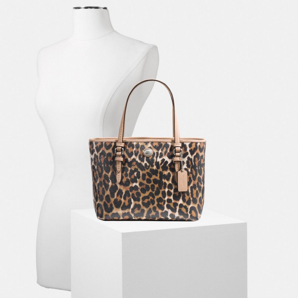 Details| | | Ocelot print coated canvas with leather trim| Inside zip, cell phone and multifunction pockets| Dogleash-clip closure, fabric lining| Handles with 5 1/2" drop| 10 3/4" (L) x 7" (H) x 3 1/4" (W)| This is a signature product