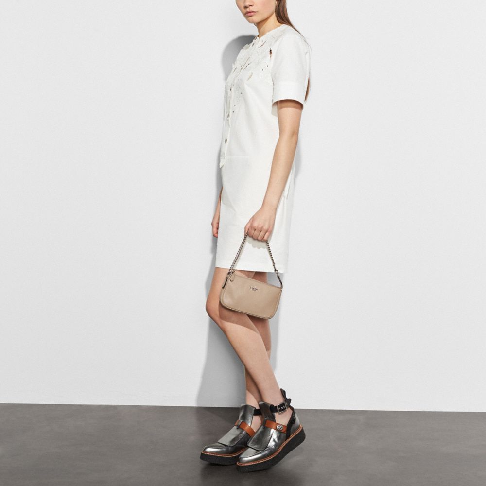 Polished pebble leather| Two credit card slots| Inside open pocket| Zip-top closure, fabric lining| Attached chain strap with dogleash clip| 7 1/2" (L) x 4 1/2" (H) x 2" (W)