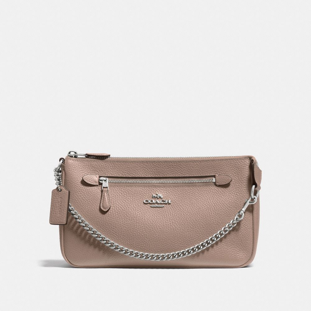 Polished pebble leather| Inside open pocket| Zip-top closure, fabric lining| Outside zip pocket| Chain strap with dogleash clip attached| 9 1/2" (L) x 5 1/2" (H) x 2 1/4" (W)