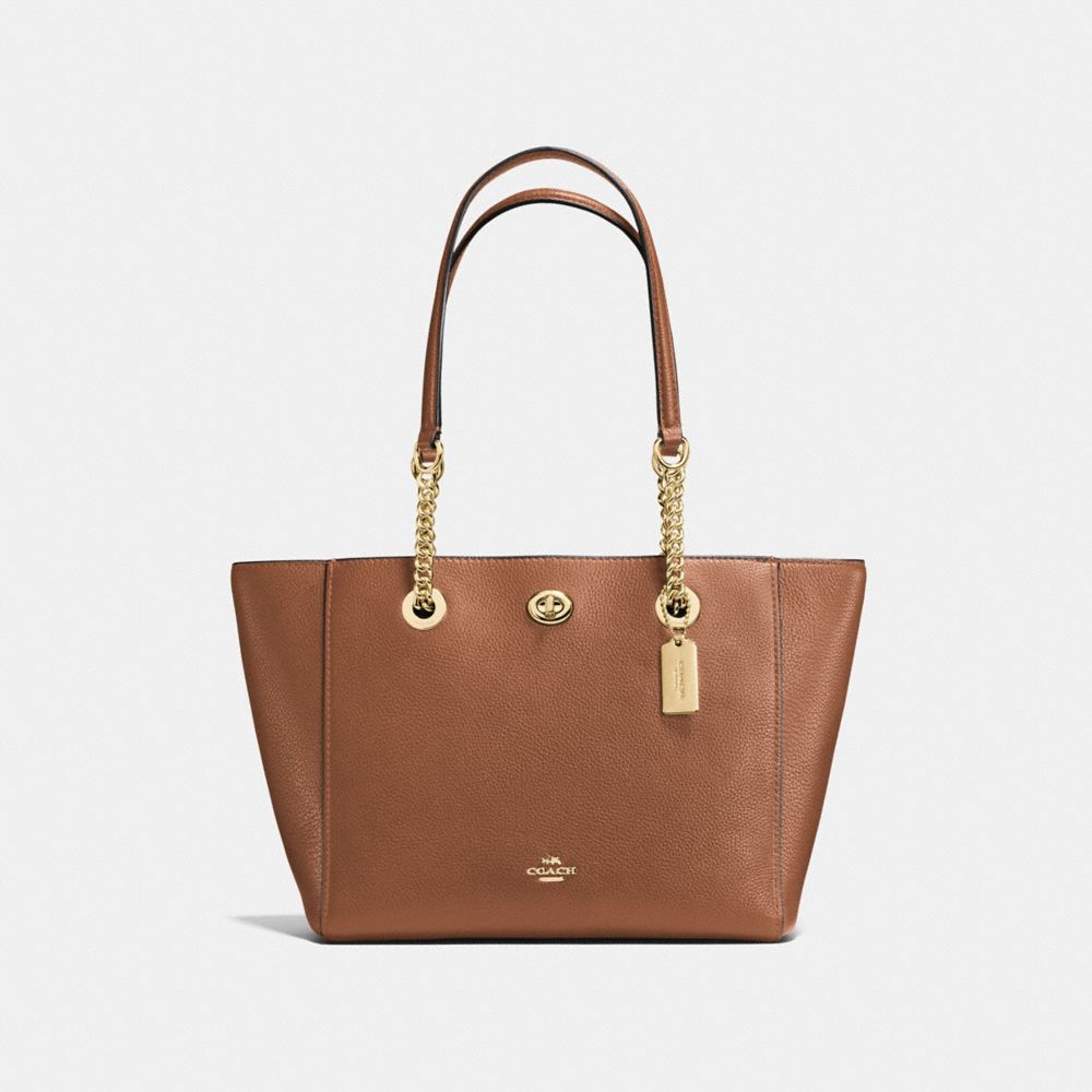 Polished pebble leather| Inside zip, cell phone and multifunction pockets| Zip-top closure, fabric lining| Handles with 9 1/4" drop| Outside slip pocket with turnlock closure| 10 3/4" (L) x 9 1/4" (H) x 5" (W)
