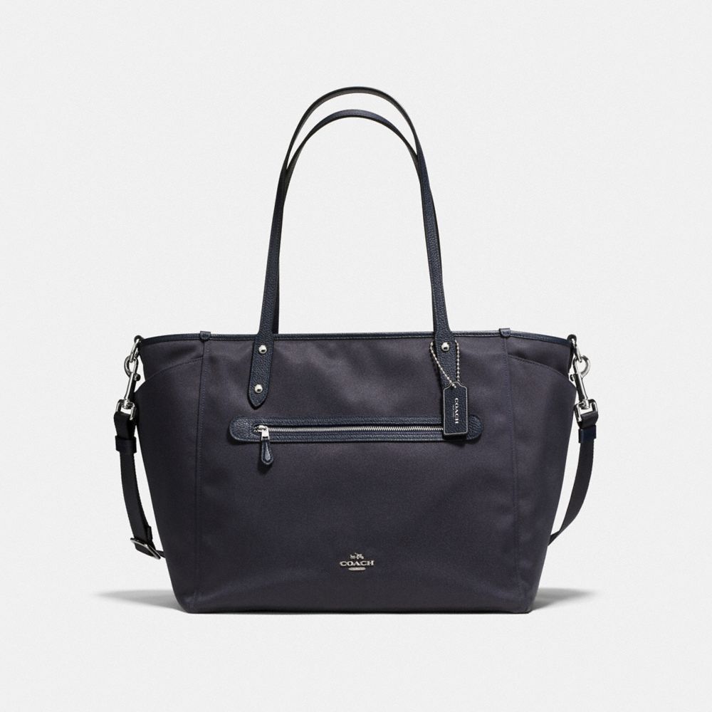 Nylon with polished pebble leather details| Inside zip and multifunction pockets| Zip-top closure, fabric lining| Handles with 10 1/2" drop| Outside zip pocket| Side gusset pockets| Detachable strap with 21 1/2" drop for shoulder or crossbody wear| Changing pad included| 14 1/4" (L) x 11 3/4" (H) x 7" (W)