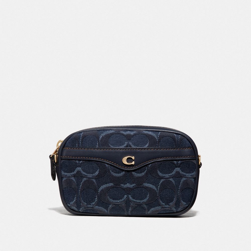 | Signature denim with refined calf leather details| Inside multifunction pockets| Zip closure, fabric lining| Outside open pocket| Adjustable strap for wear at waist| 6 3/4" (L) x 4 1/2" (H) x 1 1/2" (W)