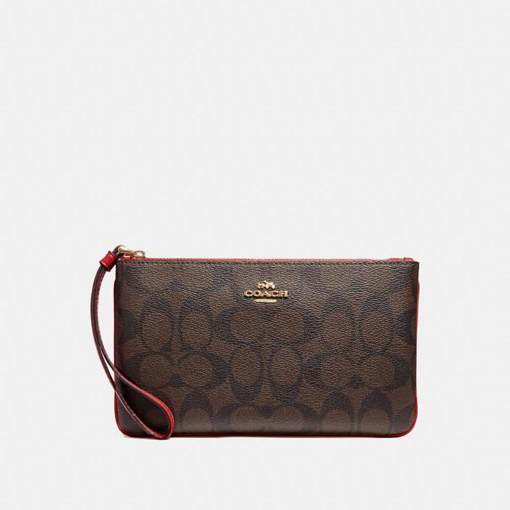 Signature coated canvas| Six credit card slots| Inside multifunction pocket| Zip-top closure, fabric lining| Wrist strap attached| 8" (L) x 4 3/4" (H) x 3/4" (W)